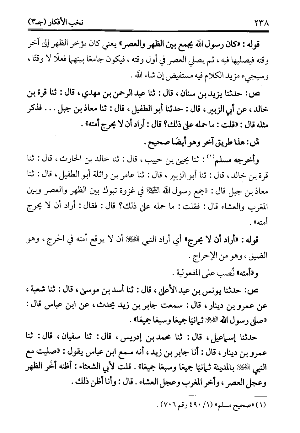وأخرجه مسلم (¬1): ثنا يحيى بن حبيب، قال: ثنا خالد بن الحارث، قال: ثنا قرة بن خالد، قال: ثنا أبو الزبير، قال: ثنا عامر بن واثلة أبو الطفيل، قال: ثنا معاذ بن جبل قال: "جمع رسول الله - عليه السلام - في غزوة تبوك بين الظهر والعصر وبين المغرب والعشاء قال: فقلت: ما حمله على ذلك؟ قال: فقال: أراد أن لا يحرج أمته".