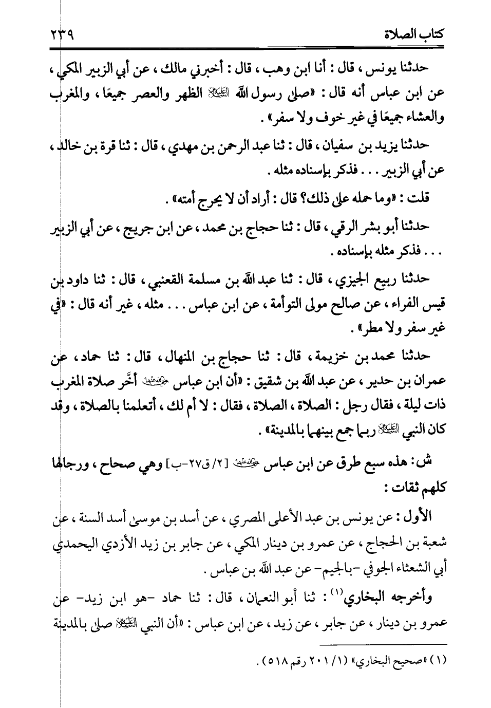 حدثنا محمد بن خزيمة، قال: ثنا حجاج بن المنهال، قال: ثنا حماد، على عمران بن حدير، عن عبد الله بن شقيق: "أن ابن عباس - رضي الله عنهما - أخَّر صلاة المغرب ذات ليلة، فقال رجل: الصلاة، الصلاة، فقال: لا أم لك، أتعلمنا بالصلاة، وقد كان النبي - عليه السلام - ربما جمع بينهما بالمدينة".
