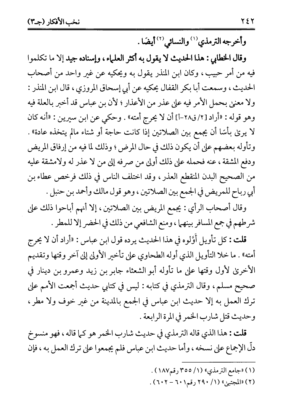 قلت: كل تأويل أَوَّلوه في هذا الحديث يرده قول ابن عباس: "أراد أن لا يحرج أمته". ما خلا التأويل الذي أوله الطحاوي على تأخير الأولى آخر وقتها وتقديم الأخرى لأول وقتها على ما تأوله أبو الشعثاء جابر بن زيد وعمرو بن دينار في صحيح مسلم، وقال الترمذي في كتابه: ليس في كتابي حديث أجمعت الأمم على ترك العمل به إلا حديث ابن عباس في الجمع بالمدينة من غير خوف ولا مطر، وحديث قتل شارب الخمر في المرة الرابعة.