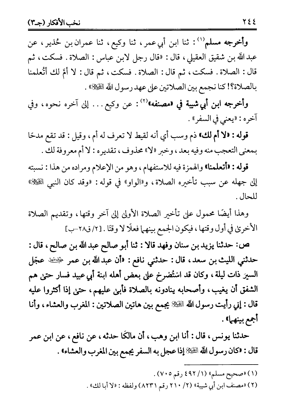 وأخرجه مسلم (¬1): ثنا ابن أبي عمر، ثنا وكيع، ثنا عمران بن حُدَير، عن عبد الله بن شقيق العقيلي، قال: "قال رجل لابن عباس: الصلاة. فسكت، ثم قال: الصلاة. فسكت، ثم قال: الصلاة. فسكت، ثم قال: لا أمَّ لك أتُعلمنا بالصلاة؟! كنا نجمع بين الصلاتين على عهد رسول الله - عليه السلام -".