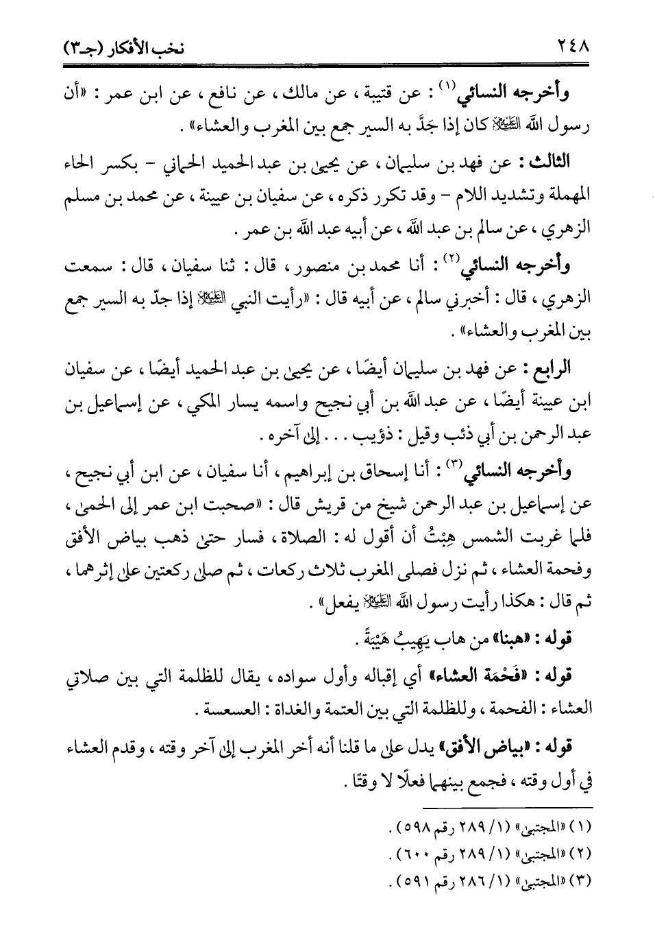 وأخرجه النسائي (¬3): أنا إسحاق بن إبراهيم، أنا سفيان، عن ابن أبي نجيح، عن إسماعيل بن عبد الرحمن شيخ من قريش قال: "صحبت ابن عمر إلى الحمى، فلما غربت الشمس هِبْتُ أن أقول له: الصلاة، فسار حتى ذهب بياض الأفق وفحمة العشاء، ثم نزل فصلى المغرب ثلاث ركعات، ثم صلى ركعتين على إثرهما، ثم قال: هكذا رأيت رسول الله - عليه السلام - يفعل".