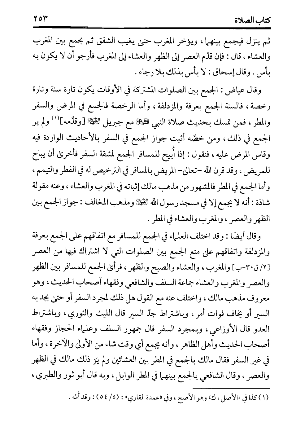 وقال أيضًا: وقد اختلف العلماء في الجمع للمسافر مع اتفاقهم على الجمع بعرفة والمزدلفة واتفاقهم على منع الجمع بين الصلوات التي لا اشتراك فيها من العصر والمغرب، والعشاء والصبح والظهر، فرأى الجمع للمسافر بين الظهر والعصر والمغرب والعشاء جماعة السلف والشافعي وفقهاء أصحاب الحديث، وهو معروف مذهب مالك، واختلف عنه مع القول هل ذلك لمجرد السفر أو حتى يجد به السير أو يخاف فوات أمر، وباشتراط جدّ السير قال الليث والثوري، وباشتراط العدو قال الأوزاعي، وبمجرد السفر قال جمهور السلف وعلماء الحجاز وفقهاء أصحاب الحديث وأهل الظاهر، وأنه يجمع أي وقت شاء من الأولى والآخرة، وأما في غير السفر فقال مالك بالجمع في المطر بين العشائين ولم يَرَ ذلك مالك في الظهر والعصر، وقال الشافعي بالجمع بينهما في المطر الوابل، وبه قال أبو ثور والطبري،