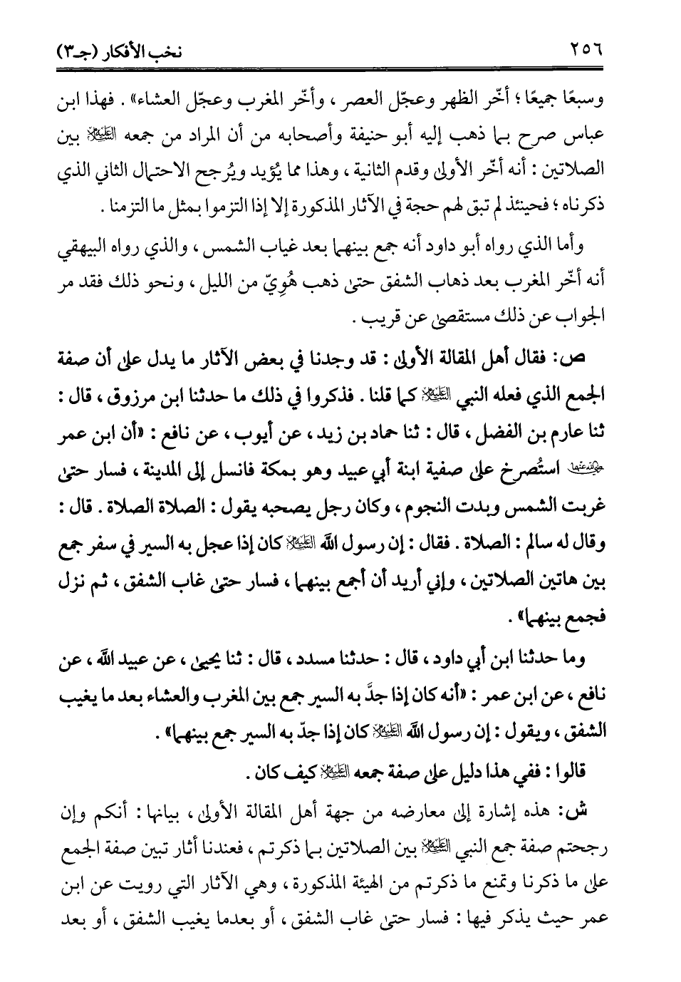 ش: هذه إشارة إلى معارضه من جهة أهل المقالة الأولى، بيانها: أنكم وإن رجحتم صفة جمع النبي - عليه السلام - بين الصلاتين بما ذكرتم، فعندنا أثار تبين صفة الجمع على ما ذكرنا وتمنع ما ذكرتم من الهيئة المذكورة، وهي الآثار التي رويت عن ابن عمر حيث يذكر فيها: فسار حتى غاب الشفق، أو بعد ما يغيب الشفق، أو بعد