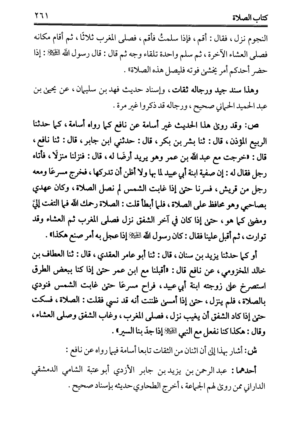 أو كما حدثنا يزيد بن سنان، قال: ثنا أبو عامر العقدي، قال: ثنا العطاف بن خالد المخزومي، عن نافع قال: "أقبلنا مع ابن عمر حتى إذا كنا ببعض الطرق استصرخ على زوجته ابنة أبي عبيد، فراح مسرعًا حتى غابت الشمس فنودي بالصلاة، فلم ينزل، حتى إذا أمسى ظننت أنه قد نسي فقلت: الصلاة، فسكت حتى إذا كاد الشفق أن يغيب نزل، فصلى المغرب، وغاب الشفق وصلى العشاء، وقال: هكذا كنا نفعل مع النبي - عليه السلام - إذا جدّ بنا السير".