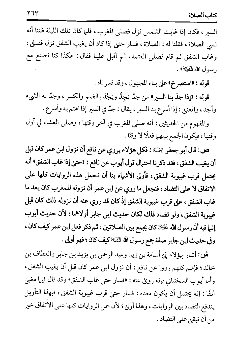 ش: أشار بهؤلاء إلى أسامة بن زيد وعبد الرحمن بن يزيد بن جابر والعطاف بن خالد؛ فإنهم كلهم رووا عن نافع: أن نزول ابن عمر كان قبل أن يغيب الشفق، وأما أيوب السختياني فإنه روى عنه: "فسار حتى غاب الشفق" وقد قال فيما مضى آنفًا: إنه يحتمل أن يكون معناه: فسار حتى قرب غيبوبة الشفق، فبهذا التأويل يندفع التضاد بين الروايات، وهذا أولى؛ لأن حمل الروايات كلها على الاتفاق خير من أن تبقى على التضاد.