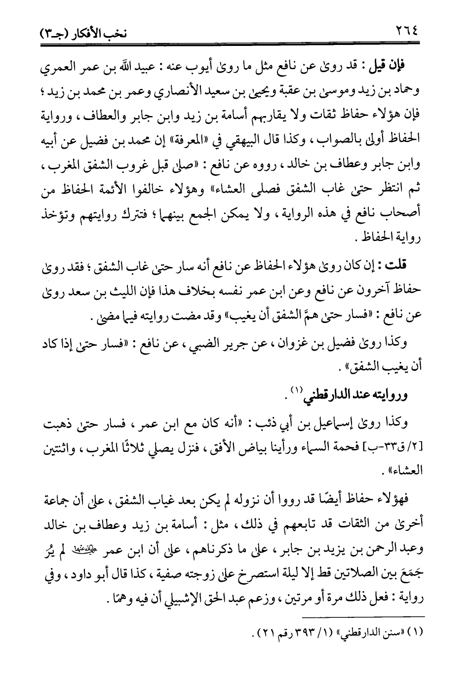 فإن قيل: قد روى عن نافع مثل ما روى أيوب عنه: عبيد الله بن عمر العمري وحماد بن زيد وموسى بن عقبة ويحيى بن سعيد الأنصاري وعمر بن محمد بن زيد؛ فإن هؤلاء حفاظ ثقات ولا يقاربهم أسامة بن زيد وابن جابر والعطاف، ورواية الحفاظ أولى بالصواب، وكذا قال البيهقي في "المعرفة" إن محمد بن فضيل عن أبيه وابن جابر وعطاف بن خالد، رووه عن نافع: "صلى قبل غروب الشفق المغرب، ثم انتظر حتى غاب الشفق فصلى العشاء" وهؤلاء خالفوا الأئمة الحفاظ من أصحاب نافع في هذه الرواية، ولا يمكن الجمع بينهما؛ فتترك روايتهم وتؤخذ رواية الحفاظ.