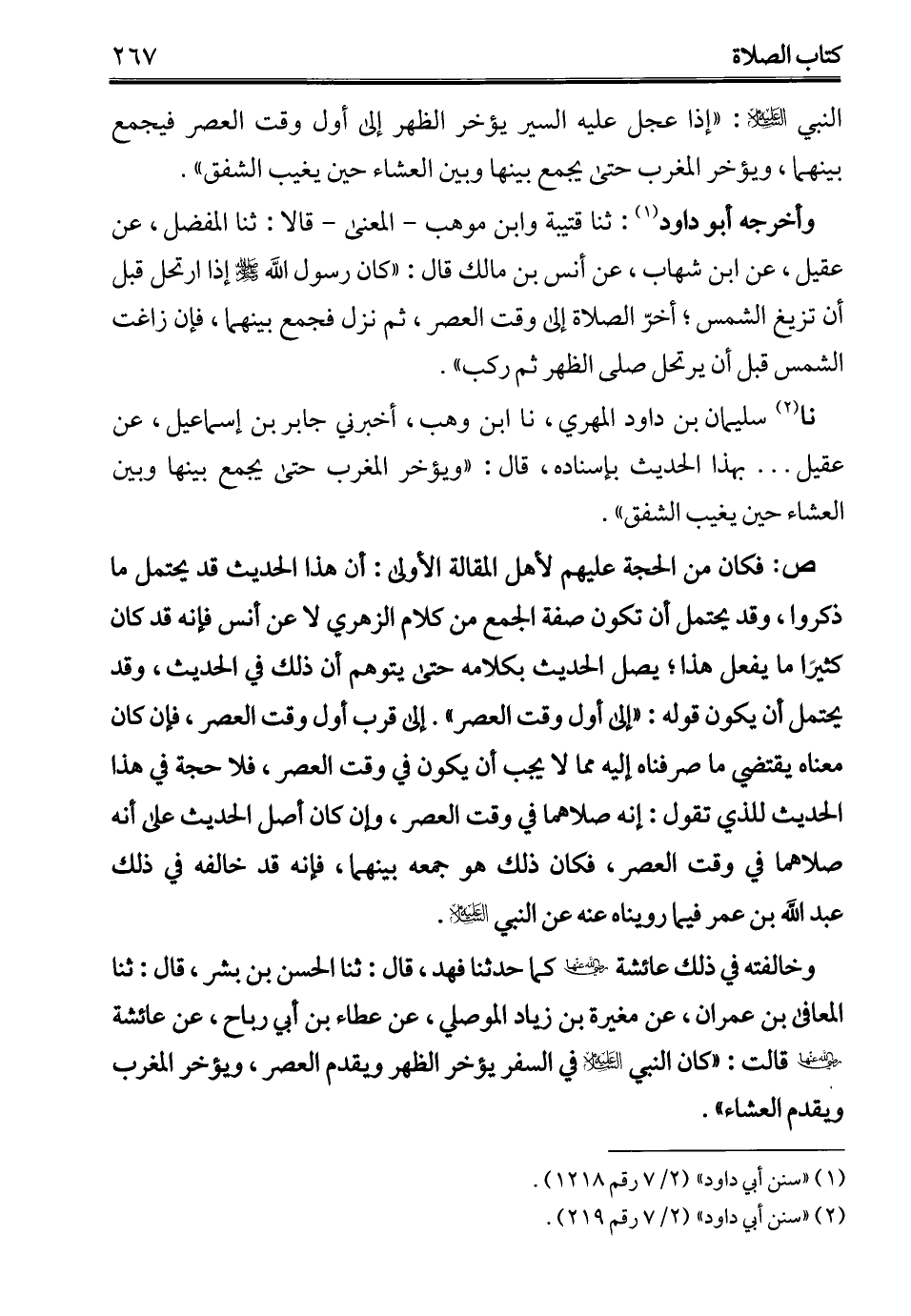 النبي - عليه السلام -: "إذا عجل عليه السير يؤخر الظهر إلى أول وقت العصر فيجمع بينهما، ويؤخر المغرب حتى يجمع بينها وبين العشاء حين يغيب الشفق".