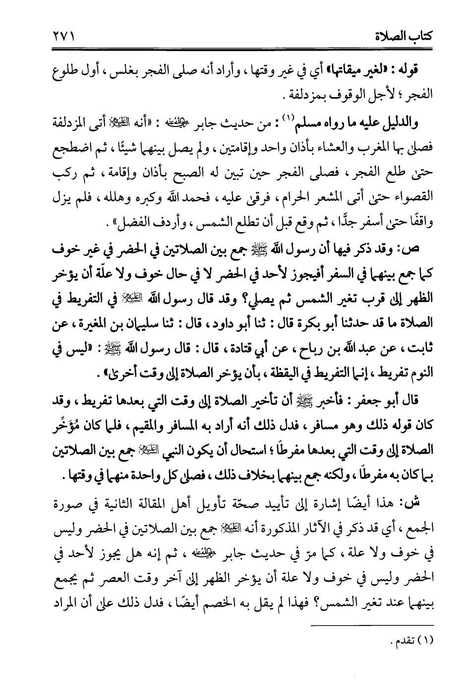قال أبو جعفر: فأخبر - صلى الله عليه وسلم - أن تأخير الصلاة إلى وقت التي بعدها تفريط، وقد كان قوله ذلك وهو مسافر، فدل ذلك أنه أراد به المسافر والمقيم، فلما كان مُؤَخِّر الصلاة إلى وقت التي بعدها مفرطًا؛ استحال أن يكون النبي - عليه السلام - جمع بين الصلاتين بما كان به مفرطًا، ولكنه جمع بينهما بخلاف ذلك، فصلى كل واحدة منهما في وقتها.