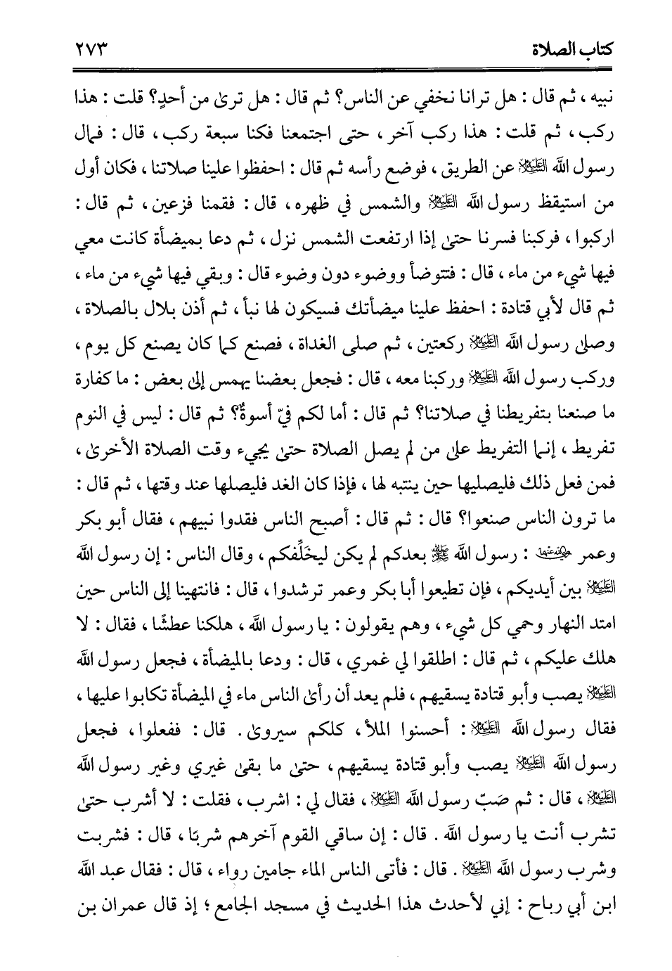 نبيه، ثم قال: هل ترانا نخفي عن الناس؟ ثم قال: هل ترى من أحدٍ؟ قلت: هذا ركب، ثم قلت: هذا ركب آخر، حتى اجتمعنا فكنا سبعة ركب، قال: فمال رسول الله - عليه السلام - عن الطريق، فوضع رأسه ثم قال: احفظوا علينا صلاتنا، فكان أول من استيقظ رسول الله - عليه السلام - والشمس في ظهره، قال: فقمنا فزعين، ثم قال: اركبوا، فركبنا فسرنا حتى إذا ارتفعت الشمس نزل، ثم دعا بميضأة كانت معي فيها شيء من ماء، قال: فتتوضأ ووضوء دون وضوء قال: وبقي فيها شيء من ماء، ثم قال لأبي قتادة: احفظ علينا ميضأتك فسيكون لها نبأ، ثم أذن بلال بالصلاة، وصلى رسول الله - عليه السلام - ركعتين، ثم صلى الغداة، فصنع كما كان يصنع كل يوم، وركب رسول الله - عليه السلام - وركبنا معه، قال: فجعل بعضنا يهمس إلى بعض: ما كفارة ما صنعنا بتفريطنا في صلاتنا؟ ثم قال: أما لكم فيّ أسوةٌ؟ ثم قال: ليس في النوم تفريط، إنما التفريط على من لم يصل الصلاة حتى يجيء وقت الصلاة الأخرى، فمن فعل ذلك فليصليها حين ينتبه لها، فإذا كان الغد فليصلها عند وقتها، ثم قال: ما ترون الناس صنعوا؟ قال: ثم قال: أصبح الناس فقدوا نبيهم، فقال أبو بكر وعمر - رضي الله عنهما -: رسول الله - صلى الله عليه وسلم - بعدكم لم يكن ليخَلِّفكم، وقال الناس: إن رسول الله - عليه السلام - بين أيديكم، فإن تطيعوا أبا بكر وعمر ترشدوا، قال: فانتهينا إلى الناس حين امتد النهار وحمي كل شيء، وهم يقولون: يا رسول الله، هلكنا عطشًا، فقال: لا هلك عليكم، ثم قال: اطلقوا لي غمري، قال: ودعا بالميضأة، فجعل رسول الله - عليه السلام - يصب وأبو قتادة يسقيهم، فلم يعد أن رأى الناس ماء في الميضأة تكابوا عليها، فقال رسول الله - عليه السلام -: أحسنوا الملأ، كلكم سيروى. قال: ففعلوا، فجعل رسول الله - عليه السلام - يصب وأبو قتادة يسقيهم، حتى ما بقى غيري وغير رسول الله - عليه السلام -، قال: ثم صَبّ رسول الله - عليه السلام -، فقال لي: اشرب، قلت: لا أشرب حتى! تشرب أنت يا رسول الله. قال: إن ساقي القوم آخرهم شربًا، قال: فشربت وشرب رسول الله - عليه السلام -. قال: فأتى الناس الماء جامين رواء، قال: فقال عبد الله ابن أبي رباح: إني لأحدث هذا الحديث في مسجد الجامع؛ إذ قال عمران بن