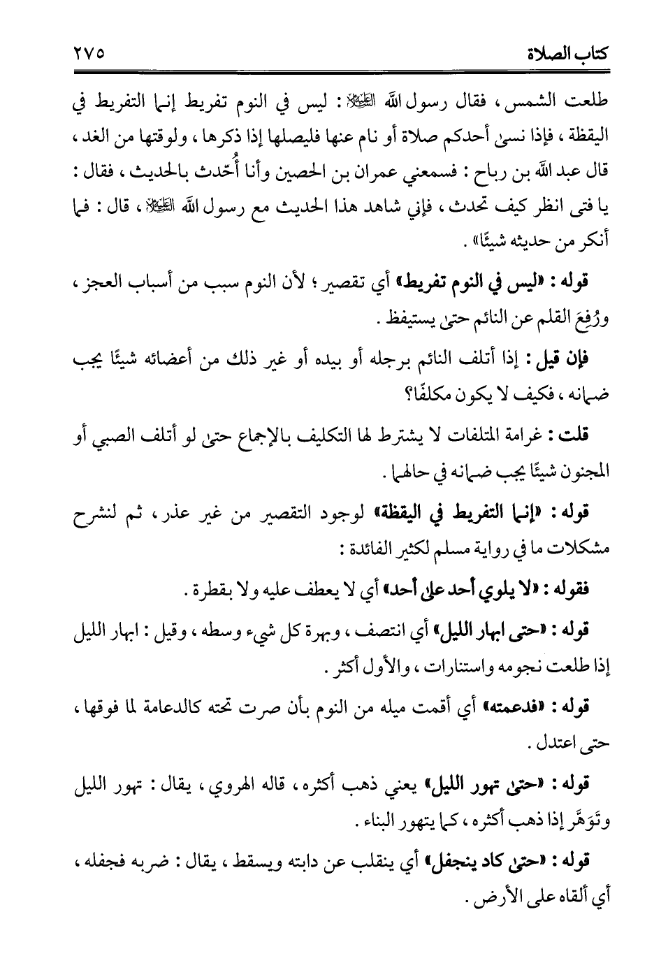 طلعت الشمس، فقال رسول الله - عليه السلام -: ليس في النوم تفريط إنما التفريط في اليقظة، فإذا نسى أحدكم صلاة أو نام عنها فليصلها إذا ذكرها، ولوقتها من الغد، قال عبد الله بن رباح: فسمعني عمران بن الحصين وأنا أُحّدث بالحديث، فقال: يا فتى انظر كيف تحدث، فإني شاهد هذا الحديث مع رسول الله - عليه السلام -، قال: فما أنكر من حديثه شيئًا".
