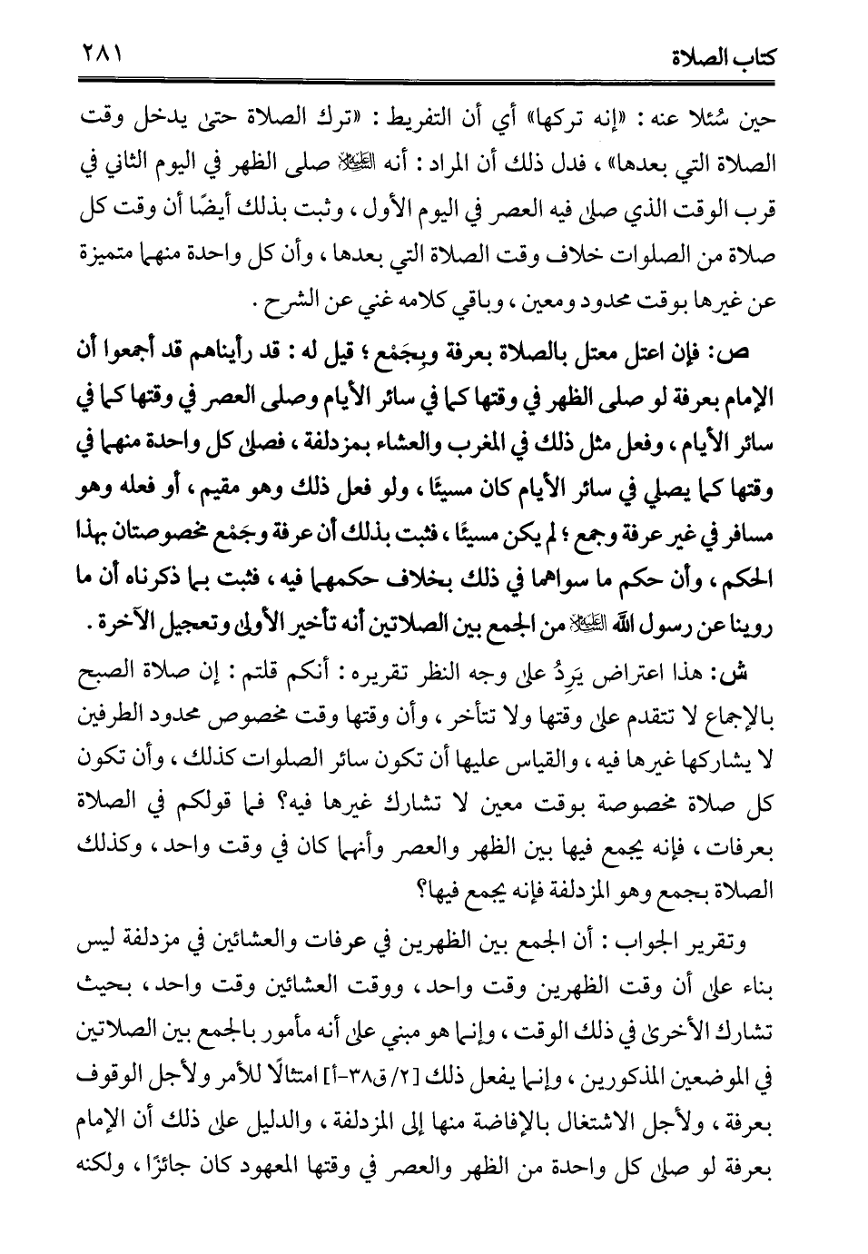 ش: هذا اعتراض يَرِدُ على وجه النظر تقريره: أنكم قلتم: إن صلاة الصبح بالإجماع لا تتقدم على وقتها ولا تتأخر، وأن وقتها وقت مخصوص محدود الطرفين لا يشاركها غيرها فيه، والقياس عليها أن تكون سائر الصلوات كذلك، وأن تكون كل صلاة مخصوصة بوقت معين لا تشارك غيرها فيه؟ فما قولكم في الصلاة بعرفات، فإنه يجمع فيها بين الظهر والعصر وأنهما كان في وقت واحد، وكذلك الصلاة بجمع وهو المزدلفة فإنه يجمع فيها؟