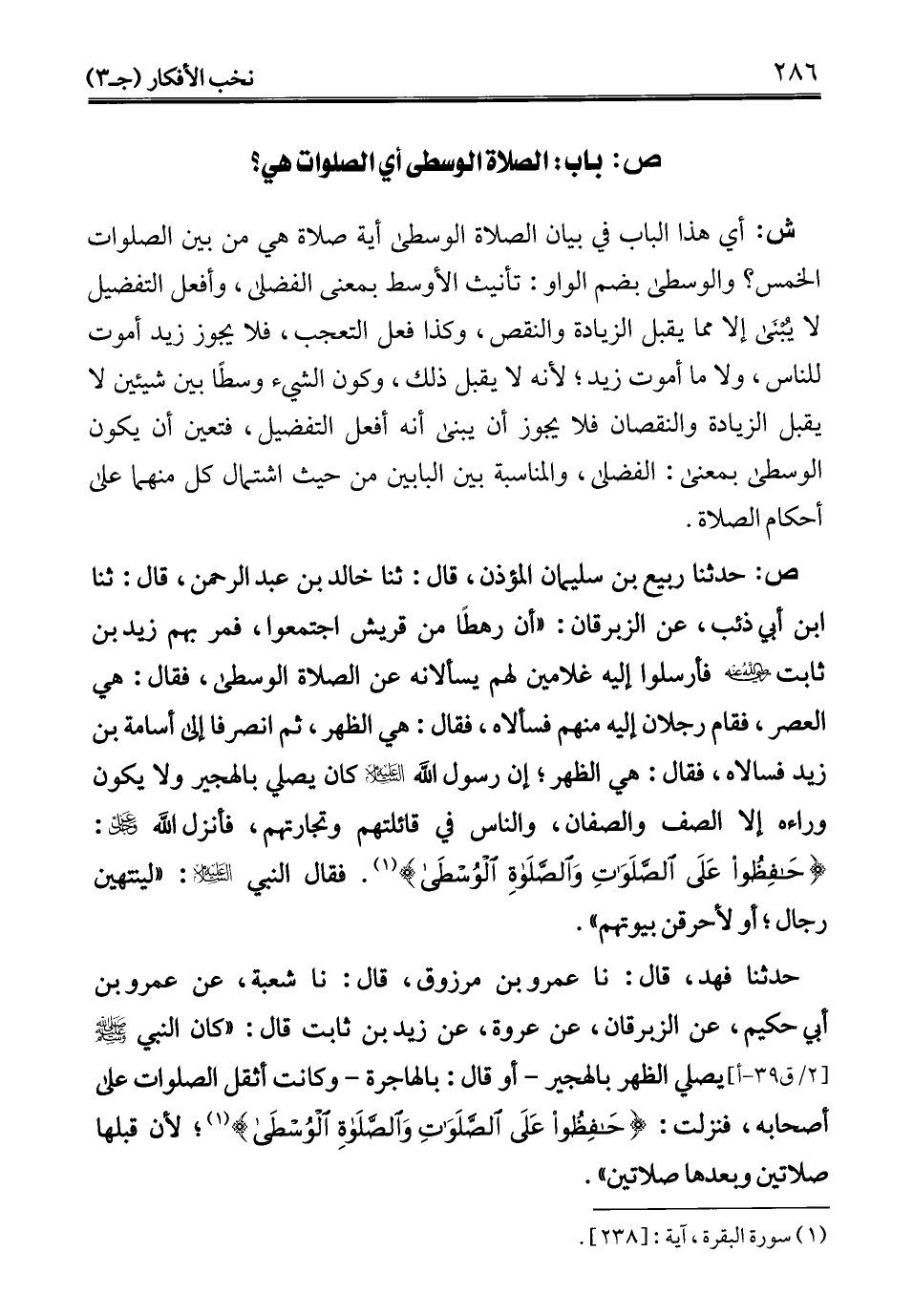 ص: حدثنا ربيع بن سليمان المؤذن، قال: ثنا خالد بن عبد الرحمن، قال: ثنا ابن أبي ذئب، عن الزبرقان: "أن رهطًا من قريش اجتمعوا، فمر بهم زيد بن ثابت - رضي الله عنه - فأرسلوا إليه غلامين لهم يسألانه عن الصلاة الوسطي، فقال: هي العصر، فقام رجلان إليه منهم فسألاه، فقال: هي الظهر، ثم انصرفا إلى أسامة بن زيد فسالاه، فقال: هي الظهر؛ إن رسول الله - عليه السلام - كان يصلي بالهجير ولا يكون وراءه إلا الصف والصفان، والناس في قائلتهم وتجارتهم، فأنزل الله -عز وجل-: {حَافِظُوا عَلَى الصَّلَوَاتِ وَالصَّلَاةِ الْوُسْطَى} (¬1). فقال النبي - عليه السلام -: "لينتهين رجال؛ أو لأحرقن بيوتهم".