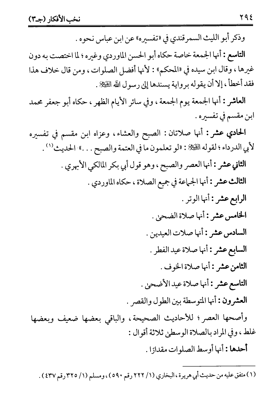 وأصحها العصر؛ للأحاديث الصحيحة، والباقي بعضها ضعيف وبعضها غلط، وفي المراد بالصلاة الوسطى ثلاثة أقوال:
