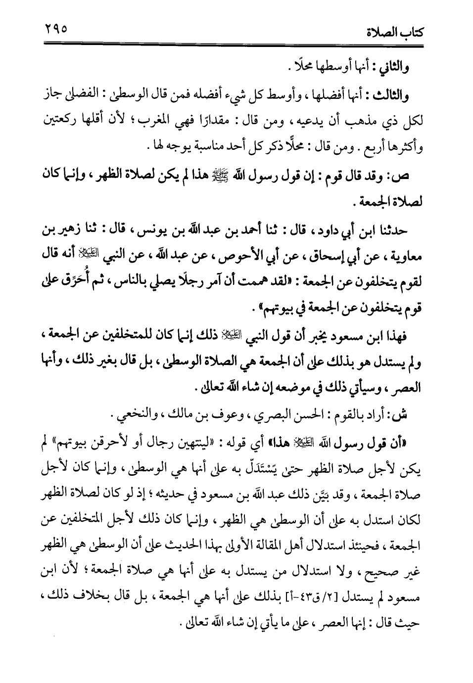 فهذا ابن مسعود يخبر أن قول النبي - عليه السلام - ذلك إنما كان للمتخلفين عن الجمعة، ولم يستدل هو بذلك على أن الجمعة هي الصلاة الوسطي، بل قال بغير ذلك، وأنها العصر، وسيأتي ذلك في موضعه إن شاء الله تعالى.