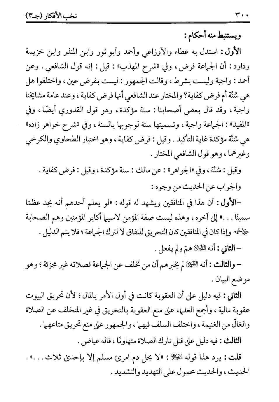 - والثالث: أنه - عليه السلام - لم يخبرهم أن من تخلف عن الجماعة فصلاته غير مجزئة؛ وهو موضع البيان.