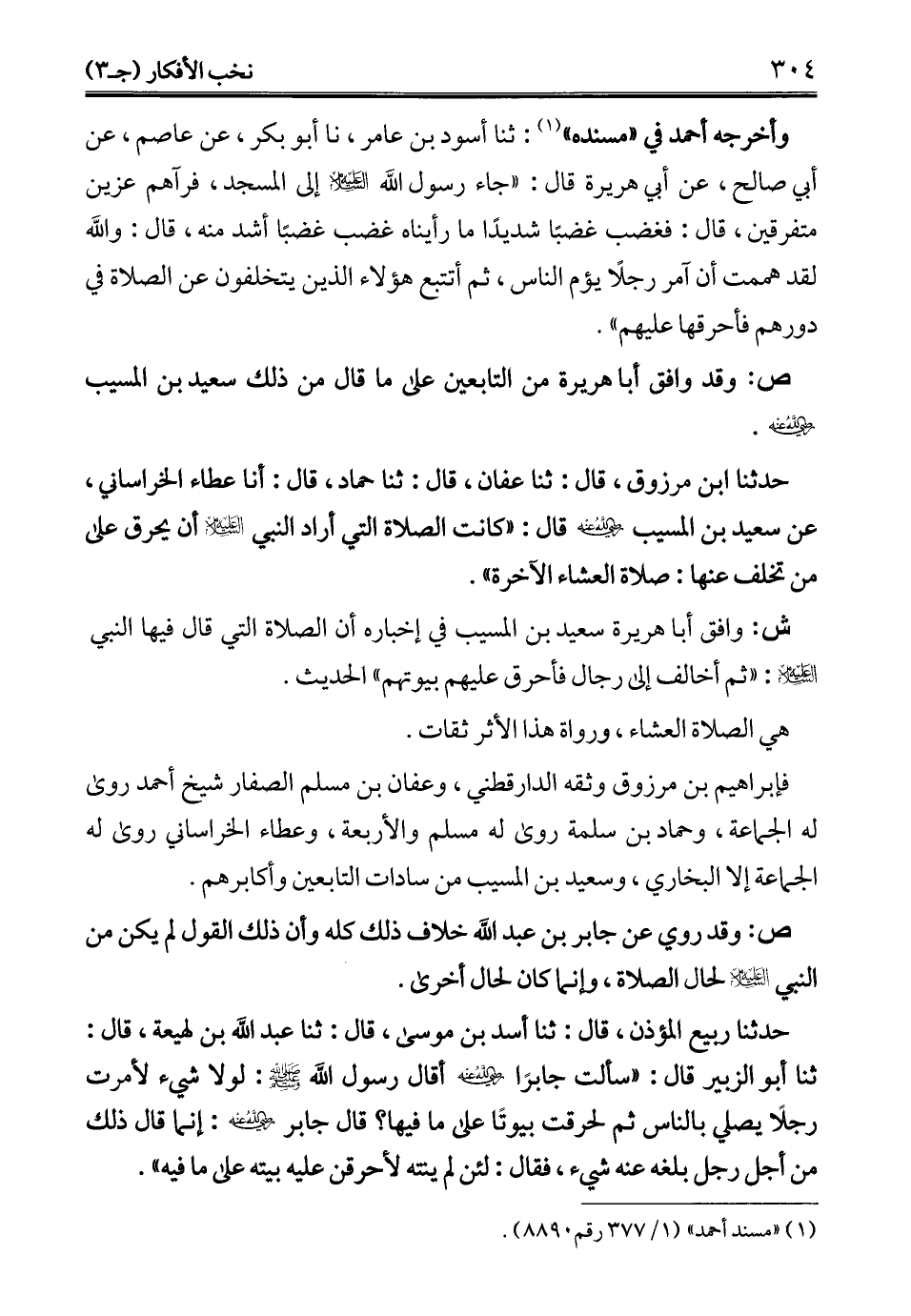 حدثنا ابن مرزوق، قال: ثنا عفان، قال: ثنا حماد، قال: أنا عطاء الخراساني، عن سعيد بن المسيب - رضي الله عنه - قال: "كانت الصلاة التي أراد النبي - عليه السلام - أن يحرق على من تخلف عنها: صلاة العشاء الآخرة".