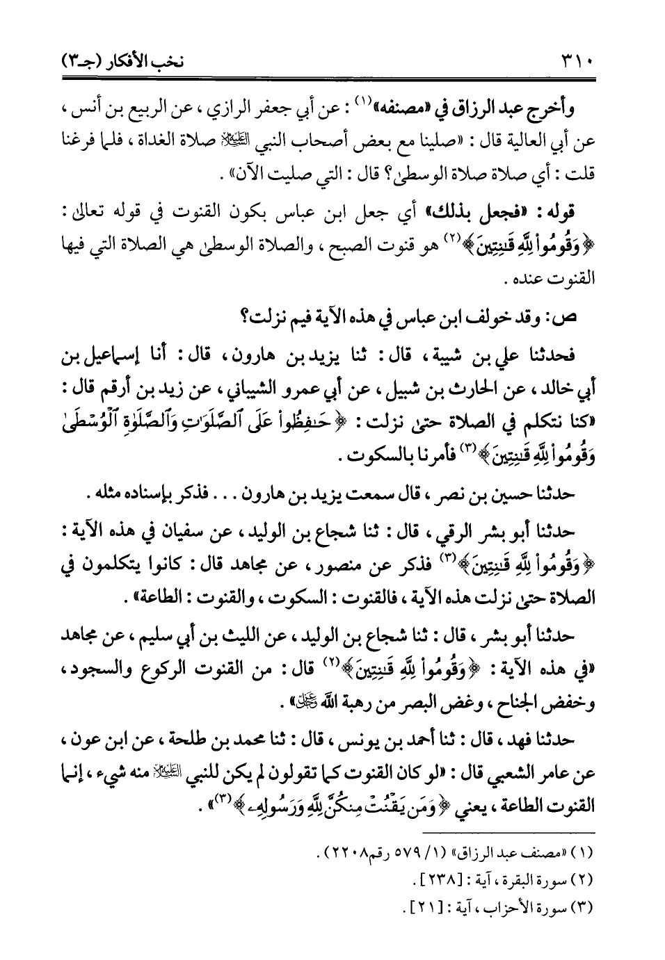 حدثنا أبو بشر الرقي، قال: ثنا شجاع بن الوليد، عن سفيان في هذه الآية: {وَقُومُوا لِلَّهِ قَانِتِينَ} (3) فذكر عن منصور، عن مجاهد قال: كانوا يتكلمون في الصلاة حتى نزلت هذه الآية، فالقنوت: السكوت، والقنوت: الطاعة".