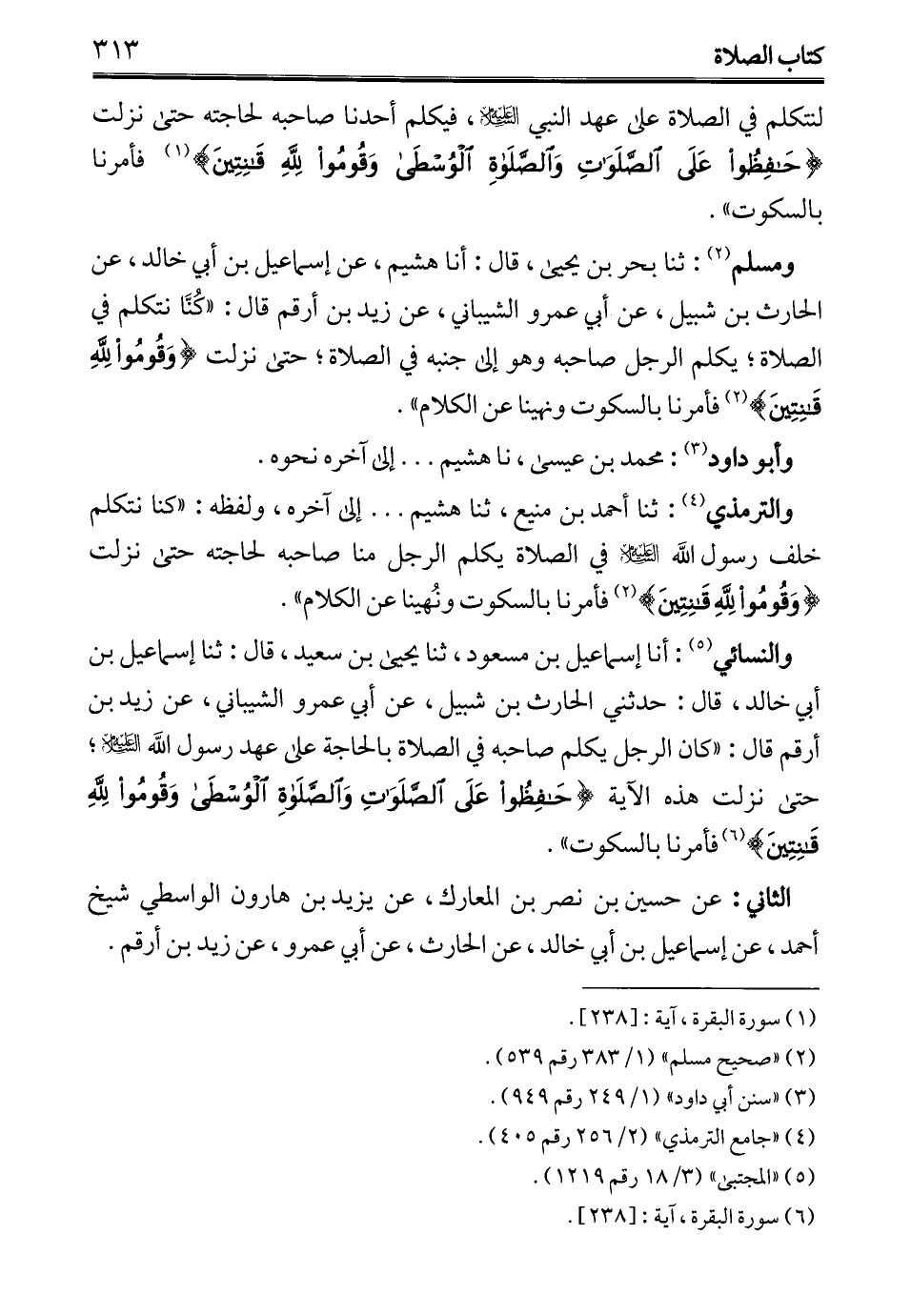 ومسلم (¬2): ثنا بحر بن يحيى، قال: أنا هشيم، عن إسماعيل بن أبي خالد، عن الحارث بن شبيل، عن أبي عمرو الشيباني، عن زيد بن أرقم قال: "كُنَّا نتكلم في الصلاة؛ يكلم الرجل صاحبه وهو إلى جنبه في الصلاة؛ حتى نزلت {وَقُومُوا لِلَّهِ قَانِتِينَ} (2) فأمرنا بالسكوت ونهينا عن الكلام".
