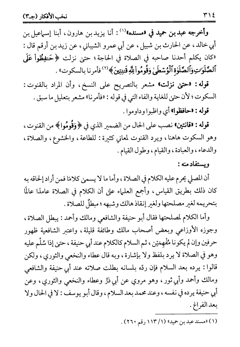 وأخرجه عبد بن حميد في "مسنده" (¬1): أنا يزيد بن هارون، أبنا إسماعيل بن أبي خالد، عن الحارث بن شبيل، عن أبي عمرو الشيباني، عن زيد بن أرقم قال: "كان يكلم أحدنا صاحبه في الصلاة في الحاجة؛ حتى نزلت {حَافِظُوا عَلَى الصَّلَوَاتِ وَالصَّلَاةِ الْوُسْطَى وَقُومُوا لِلَّهِ قَانِتِينَ} (¬2) فأمرنا بالسكوت".