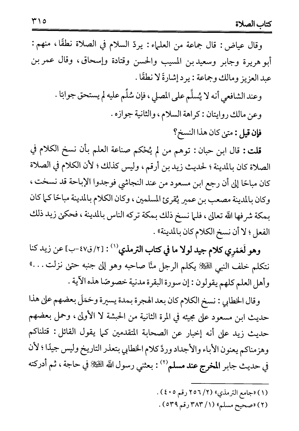 قلت: قال ابن حبان: توهم من لم يُحْكم صناعة العلم بأن نسخ الكلام في الصلاة كان بالمدينة؛ لحديث زيد بن أرقم، وليس كذلك؛ لأن الكلام في الصلاة كان مباحًا إلى أن رجع ابن مسعود من عند النجاشي فوجدوا الإباحة قد نسخت، وكان بالمدينة مصعب بن عمير يُقرئ المسلمين، وكان الكلام بالمدينة مباحًا كما كان بمكة شرفها الله تعالى، فلما نسخ ذلك بمكة تركه الناس بالمدينة، فحكى زيد ذلك الفعل؛ لا أن نسخ الكلام كان بالمدينة".