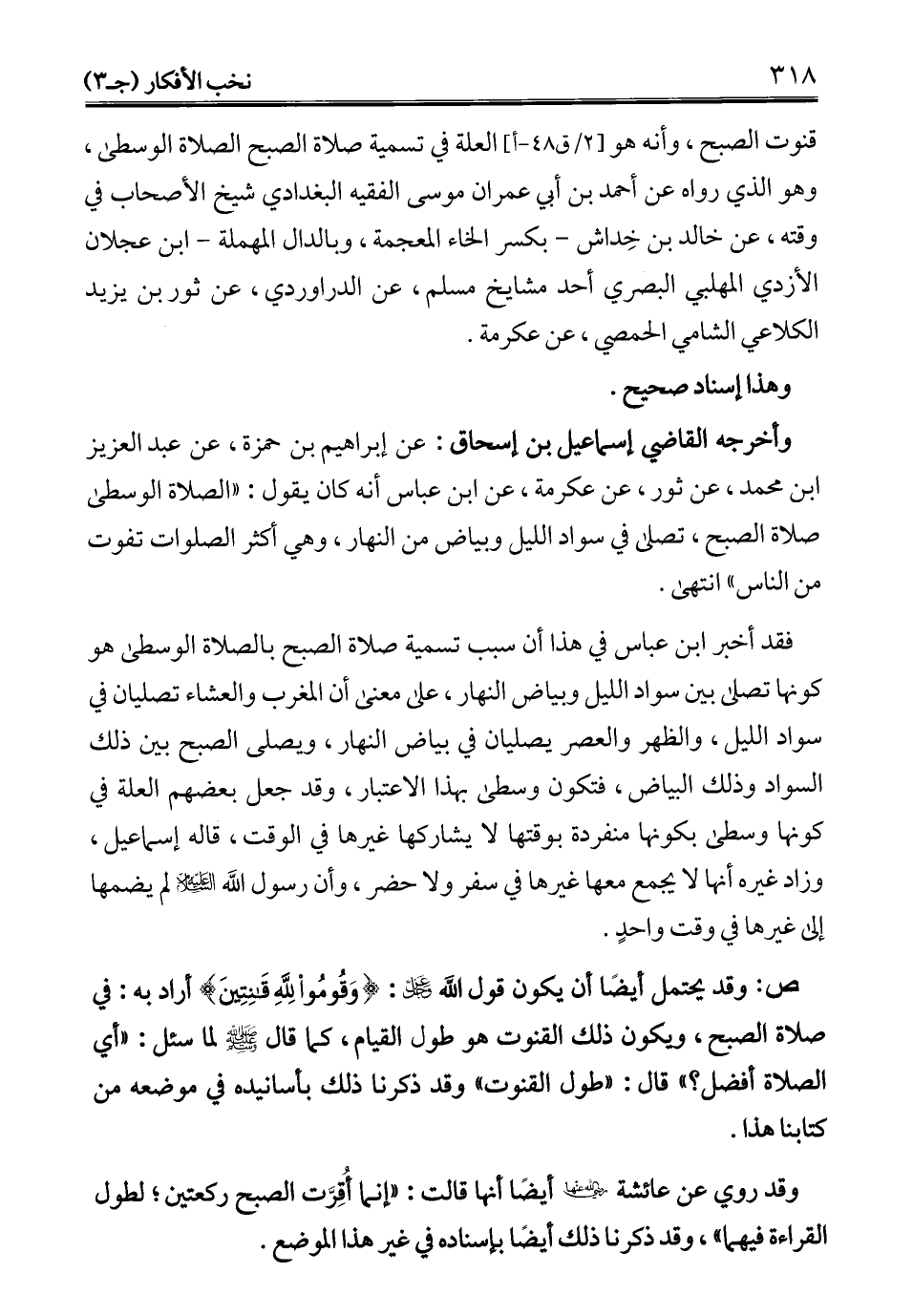 وأخرجه القاضي إسماعيل بن إسحاق: عن إبراهيم بن حمزة، عن عبد العزيز ابن محمَّد، عن ثور، عن عكرمة، عن ابن عباس أنه كان يقول: "الصلاة الوسطى صلاة الصبح، تصلى في سواد الليل وبياض من النهار، وهي أكثر الصلوات تفوت من الناس" انتهى.