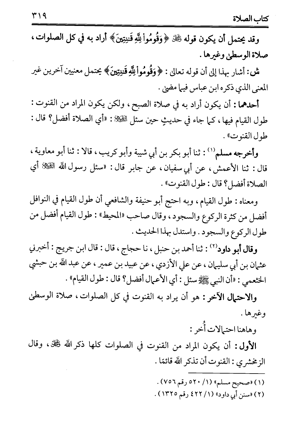 ش: أشار بهذا إلى أن قوله تعالى: {وَقُومُوا لِلَّهِ قَانِتِينَ} يحتمل معنيين آخرين غير المعنى الذي ذكره ابن عباس فيما مضى.