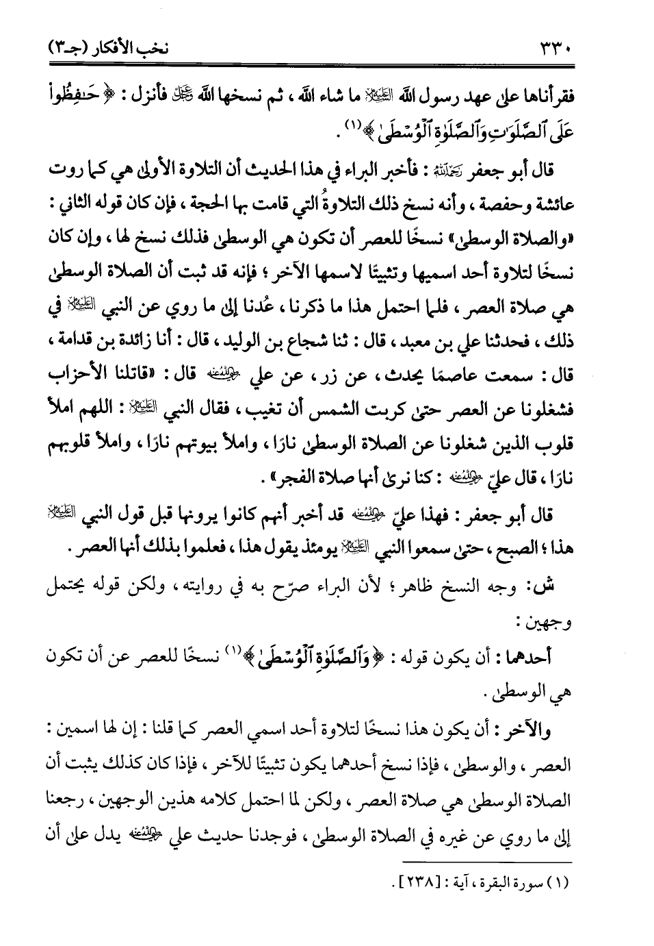 قال أبو جعفر -رحمه الله-: فأخبر البراء في هذا الحديث أن التلاوة الأولى هي كما روت عائشة وحفصة، وأنه نسخ ذلك التلاوةُ التي قامت بها الحجة، فإن كان قوله الثاني: "والصلاة الوسطى" نسخًا للعصر أن تكون هي الوسطى فذلك نسخ لها، وإن كان نسخًا لتلاوة أحد اسميها وتثبيتًا لاسمها الآخر؛ فإنه قد ثبت أن الصلاة الوسطى هي صلاة العصر، فلما احتمل هذا ما ذكرنا، عُدنا إلى ما روي عن النبي - عليه السلام - في ذلك، فحدثنا علي بن معبد، قال: ثنا شجاع بن الوليد، قال: أنا زائدة بن قدامة، قال: سمعت عاصمًا يحدث، عن زر، عن علي - رضي الله عنه - قال: "قاتلنا الأحزاب فشغلونا عن العصر حتى كربت الشمس أن تغيب، فقال النبي - عليه السلام -: اللهم املأ قلوب الذين شغلونا عن الصلاة الوسطى نارًا، واملأ بيوتهم نارًا، واملأ قلوبهم نارًا، قال عليّ - رضي الله عنه -: كنا نرى أنها صلاة الفجر".