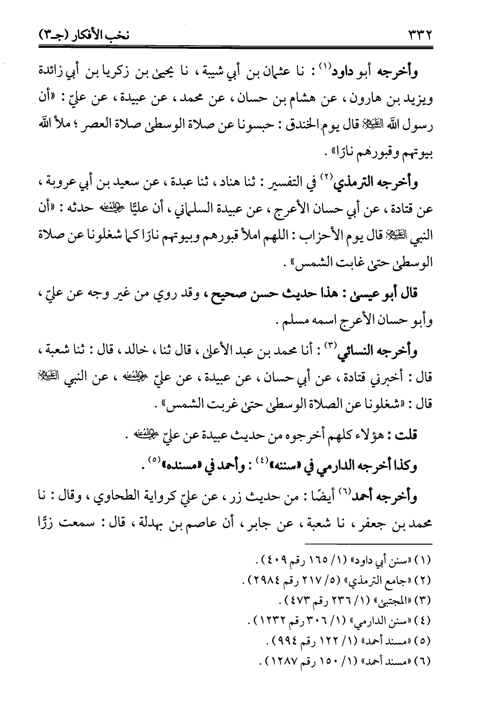 وأخرجه أبو داود (¬1): نا عثمان بن أبي شيبة، نا يحيى بن زكريا بن أبي زائدة ويزيد بن هارون، عن هشام بن حسان، عن محمد، عن عبيدة، عن عليّ: "أن رسول الله - عليه السلام - قال يوم الخندق: حبسونا عن صلاة الوسطى صلاة العصر؛ ملأ الله بيوتهم وقبورهم نارًا".