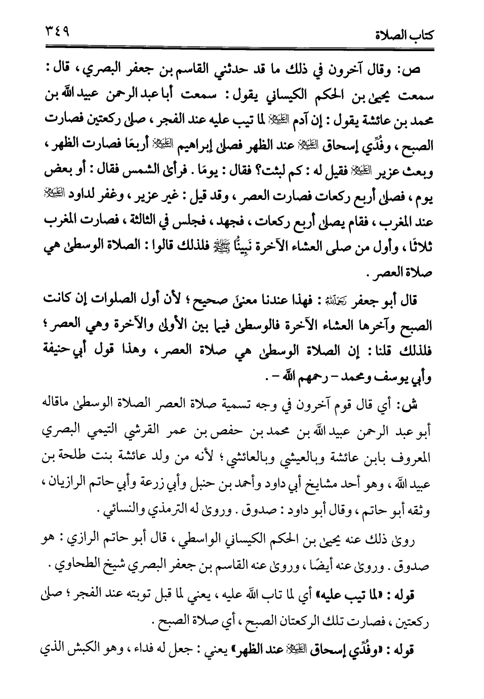 ص: وقال آخرون في ذلك ما قد حدثني القاسم بن جعفر البصري، قال: سمعت يحيى بن الحكم الكيساني يقول: سمعت أبا عبد الرحمن عبيد الله بن محمد بن عائشة يقول: إن آدم - عليه السلام - لما تيب عليه عند الفجر، صلى ركعتين فصارت الصبح، وفُدِّي إسحاق - عليه السلام - عند الظهر فصلى إبراهيم - عليه السلام - أربعًا فصارت الظهر، وبعث عزير - عليه السلام - فقيل له: كم لبثت؟ فقال: يومًا. فرأى الشمس فقال: أو بعض يوم، فصلى أربع ركعات فصارت العصر، وقد قيل: غير عزير، وغفر لداود - عليه السلام - عند المغرب، فقام يصلى أربع ركعات، فجهد، فجلس في الثالثة، فصارت المغرب ثلاثًا، وأول من صلى العشاء الآخرة نَبِينُّا - صلى الله عليه وسلم - فلذلك قالوا: الصلاة الوسطى هي صلاة العصر.