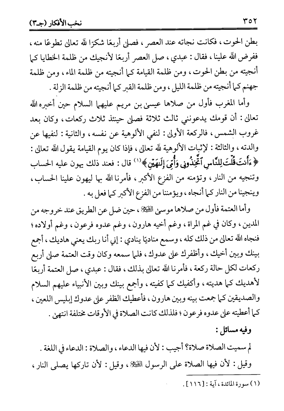 بطن الحوت، فكانت نجاته عند العصر، فصلى أربعًا شكرًا لله تعالى تطوعًا منه، ففرض الله علينا، فقال: عبدى، الأصل العصر أربعًا لأنجيك من ظلمة الخطايا كما أنجيته من بطن الحوت، ومن ظلمة القيامة كما أنجيته من ظلمة الماء، ومن ظلمة جهنم كما أنجيته من ظلمة الليل، ومن ظلمة القبر كما أنجيته من ظلمة الزلة.