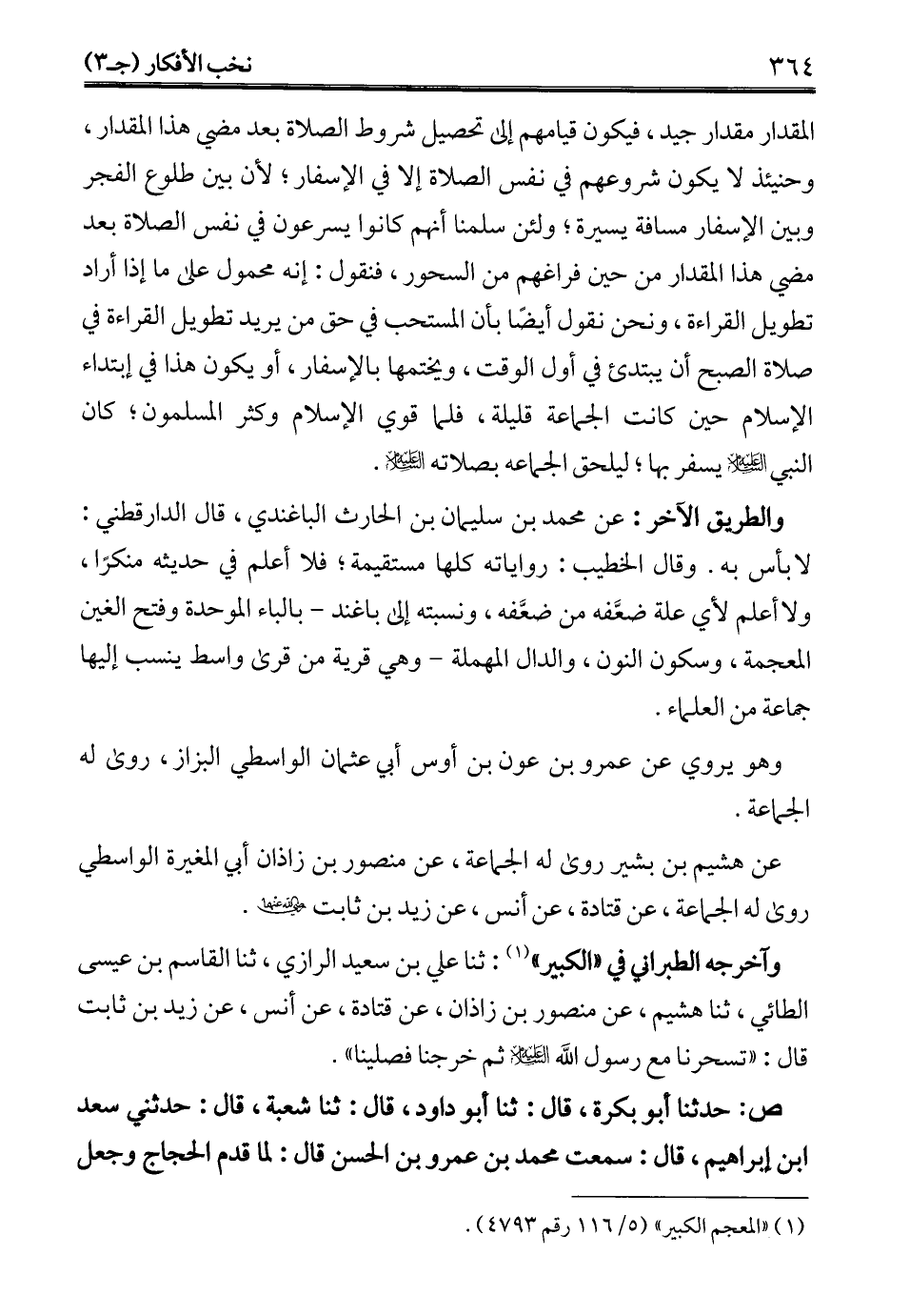 وأخرجه الطبراني في "الكبير" (¬1): ثنا علي بن سعيد الرازي، ثنا القاسم بن عيسى الطائي، ثنا هشيم، عن منصور بن زاذان، عن قتادة، عن أنس، عن زيد بن ثابت قال: "تسحرنا مع رسول الله - عليه السلام - ثم خرجنا فصلينا".