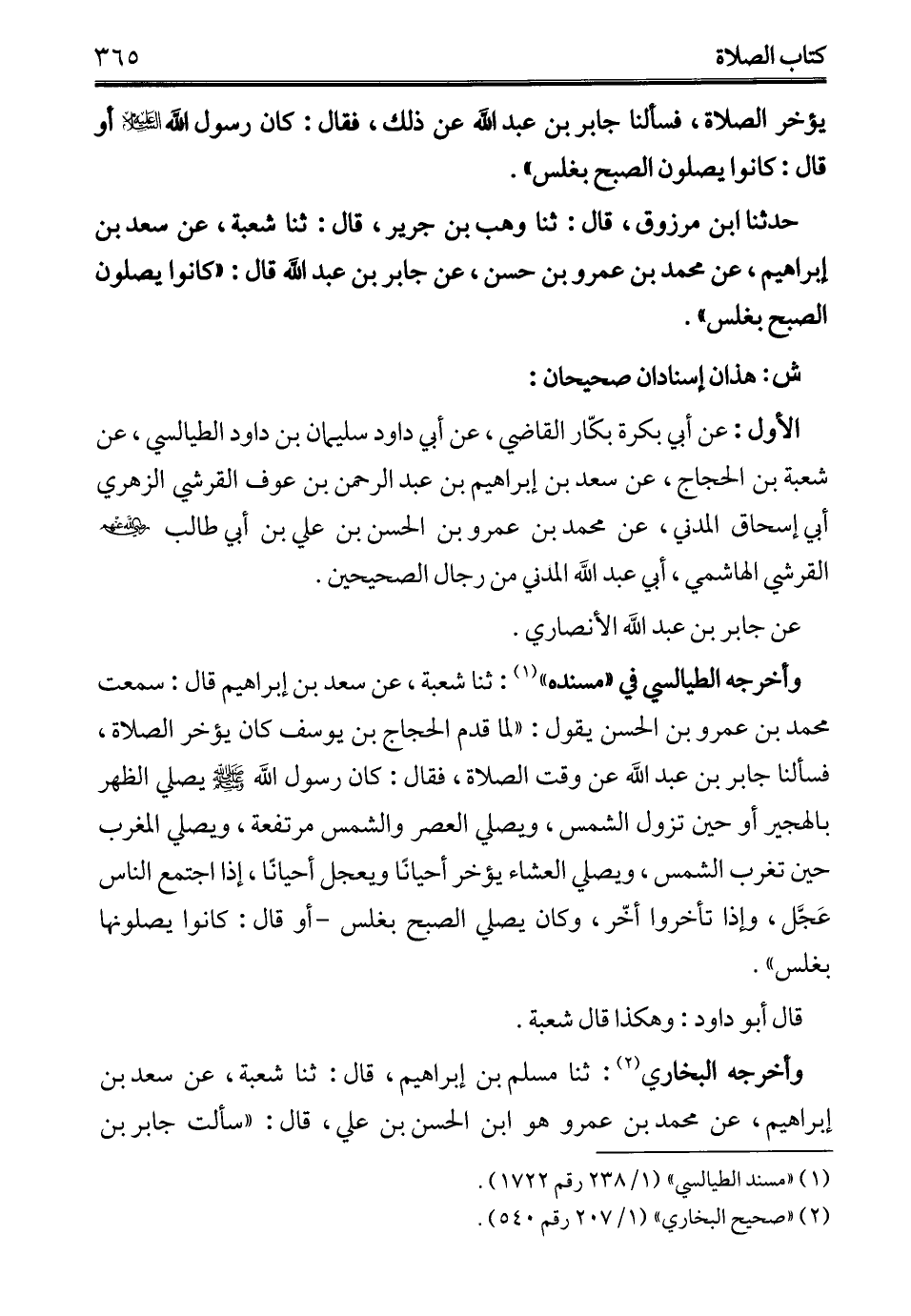 حدثنا ابن مرزوق، قال: ثنا وهب بن جرير، قال: ثنا شعبة، عن سعد بن إبراهيم، عن محمد بن عمرو بن حسن، عن جابر بن عبد الله قال: "كانوا يصلون الصبح بغلس".