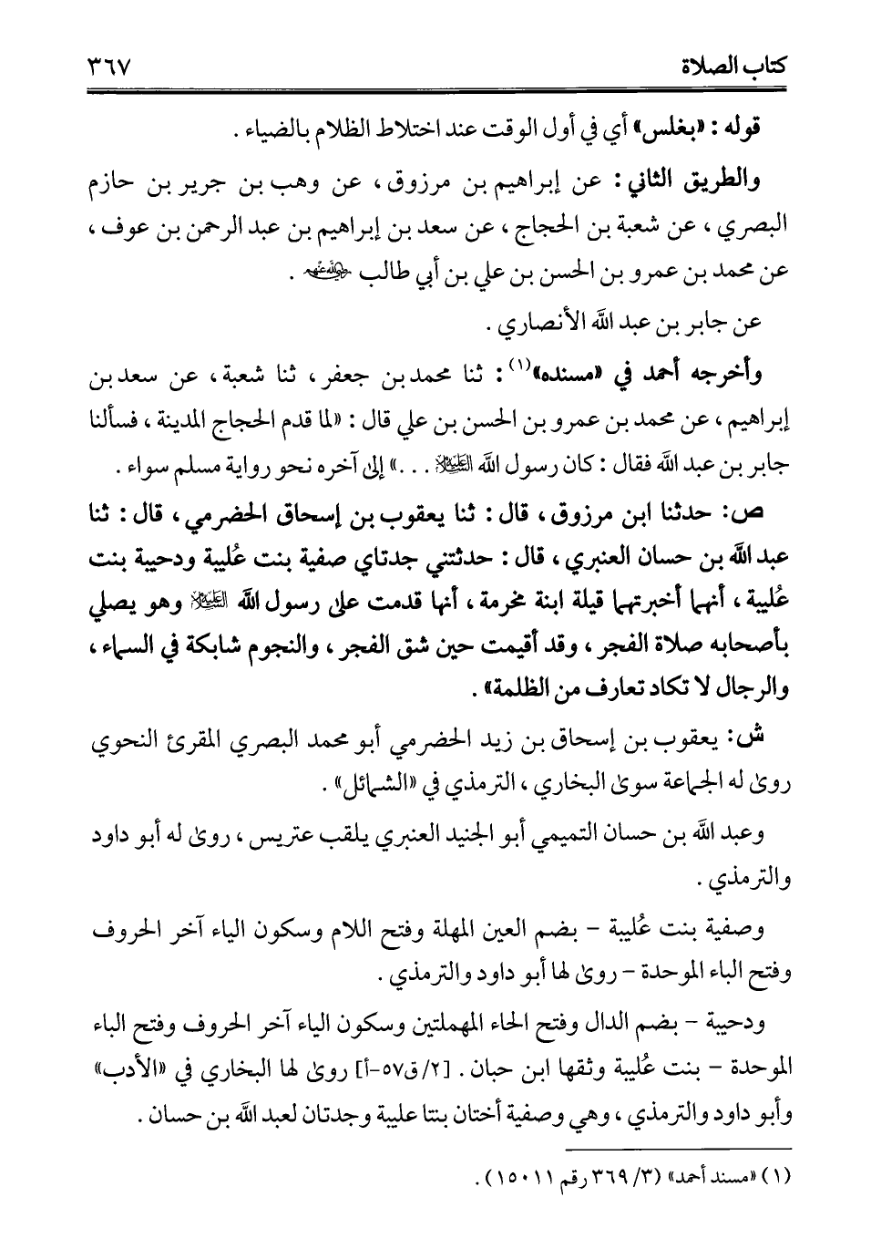 ص: حدثنا ابن مرزوق، قال: ثنا يعقوب بن إسحاق الحضرمي، قال: ثنا عبد الله بن حسان العنبري، قال: حدثتني جدتاي صفية بنت عُليبة ودحيبة بنت عُليبة، أنهما أخبرتهما قيلة ابنة مخرمة، أنها قدمت على رسول الله - عليه السلام - وهو يصلي بأصحابه صلاة الفجر، وقد أقيمت حين شق الفجر، والنجوم شابكة في السماء، والرجال لا تكاد تعارف من الظلمة".
