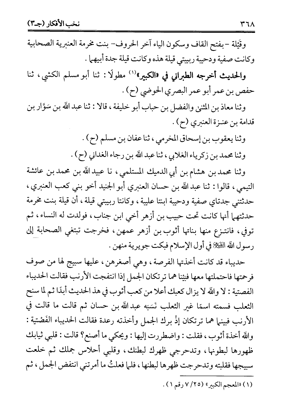 وثنا محمد بن هشام بن أبي الدميك المستلمي، نا عبيد الله بن محمد بن عائشة التيمي، قالوا: ثنا عبد الله بن حسان العنبري أبو الجنيد أخو بني كعب العنبري، حدثتني جدتاي صفية ودحيبة ابنتا عليبة، وكانتا ربيبتي قيلة، أن قيلة بنت مخرمة حدثتهما أنها كانت تحت حبيب بن أزهر أخي ابن جناب، فولدت له النساء، ثم توفي، فانتزع منها بناتها أثوب بن أزهر عمهن، فخرجت تبتغي الصحابة إلى رسول الله - عليه السلام - في أول الإِسلام فبكت جويرية منهن.