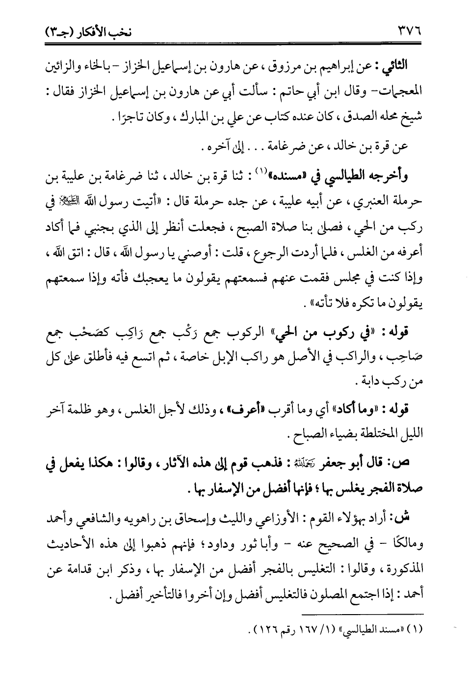 ش: أراد بهؤلاء القوم: الأوزاعي والليث وإسحاق بن راهويه والشافعي وأحمد ومالكًا -في الصحيح عنه- وأبا ثور وداود؛ فإنهم ذهبوا إلى هذه الأحاديث المذكورة، وقالوا: التغليس بالفجر أفضل من الإسفار بها، وذكر ابن قدامة عن أحمد: إذا اجتمع المصلون فالتغليس أفضل وإن أخروا فالتأخير أفضل.