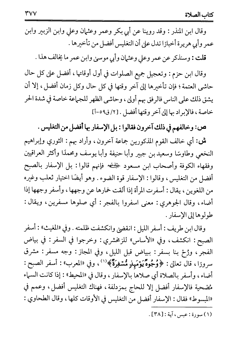 وقال ابن طريف: أسفر الليل: انقضى انكشفت ظلمته. وفي "المغيث": أسفر الصبح: انكشف، وفي "الأساس" للزمخشري: وخرجوا في السفر: في بياض الفجر، ورُحْ بنا بسفر: ببياض قبل الليل، وفي المجاز: وجه مسفر: مشرق سرورًا، قال تعالى: {وُجُوهٌ يَوْمَئِذٍ مُسْفِرَةٌ} (¬1)، وفي "المعرب": أسفر الصبح: أضاء، وأسفر بالصلاة أي صلاها بالإسفار، وقال في "المحيط": إذا كانت السماء مُصْحية فالإسفار أفضل إلا للحاج بمزدلفة، فهناك التغليس أفضل، وعمم في "المبسوط" فقال: الإسفار أفضل من التغليس في الأوقات كلها، وقال الطحاوي:
