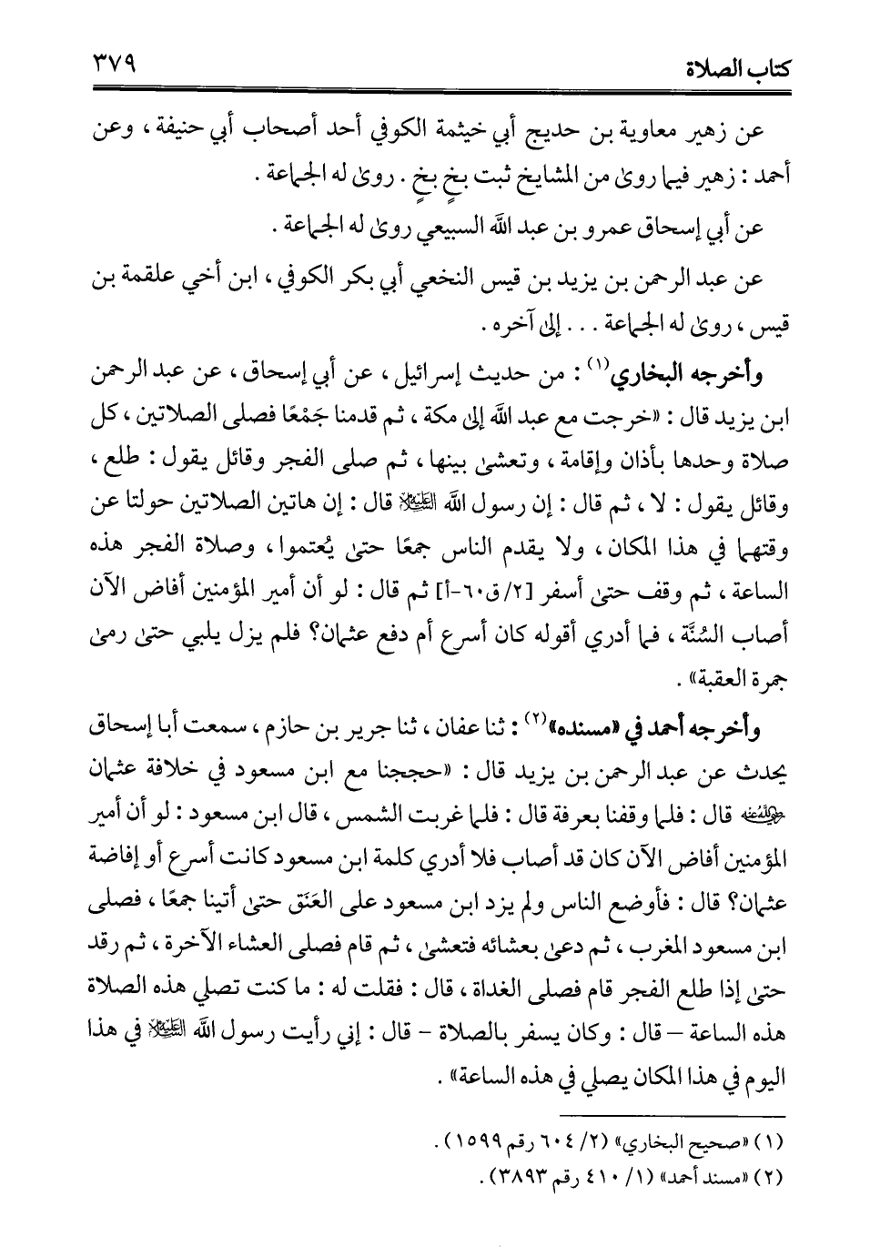 وأخرجه أحمد في "مسنده" (¬2): ثنا عفان، ثنا جرير بن حازم، سمعت أبا إسحاق يحدث عن عبد الرحمن بن يزيد قال: "حججنا مع ابن مسعود في خلافة عثمان - رضي الله عنه - قال: فلما وقفنا بعرفة قال: فلما غربت الشمس، قال ابن مسعود: لو أن أمير المؤمنين أفاض الآن كان قد أصاب فلا أدري كلمة ابن مسعود كانت أسرع أو إفاضة عثمان؟ قال: فأوضع الناس ولم يزد ابن مسعود على العَنَق حتى أتينا جمعًا، فصلى ابن مسعود المغرب، ثم دعى بعشائه فتعشى، ثم قام فصلى العشاء الآخرة، ثم رقد حتى إذا طلع الفجر قام فصلى الغداة، قال: فقلت له: ما كنت تصلي هذه الصلاة هذه الساعة -قال: وكان يسفر بالصلاة- قال: إني رأيت رسول الله - عليه السلام - في هذا اليوم في هذا المكان يصلي في هذه الساعة".