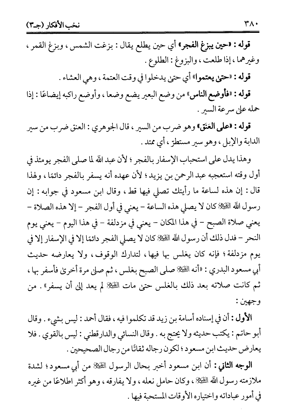وهذا يدل على استحباب الإسفار بالفجر؛ لأن عبد الله لما صلى الفجر يومئذ في أول وقته استعجبه عبد الرحمن بن يزيد؛ لأن عهده أنه يسفر بالفجر دائمًا، ولهذا قال: إن هذه لساعة ما رأيتك تصلي فيها قط، وقال ابن مسعود في جوابه: إن رسول الله - عليه السلام - كان لا يصلي هذه الساعة -يعني في أول الفجر- إلا هذه الصلاة -يعني صلاة الصبح- في هذا المكان -يعني في مزدلفة- في هذا اليوم -يعني يوم النحر- فدل ذلك أن رسول الله - عليه السلام - كان لا يصلي الفجر دائمًا إلا في الإسفار إلا في يوم مزدلفة؛ فإنه كان يغلس بها فيها، لتدارك الوقوف، ولا يعارضه حديث أبي مسعود البدري: "أنه - عليه السلام - صلى الصبح بغلس، ثم صلى مرة أخرى فأسفر بها، ثم كانت صلاته بعد ذلك بالغلس حتى مات - عليه السلام - لم يعد إلى أن يسفر". من وجهين: