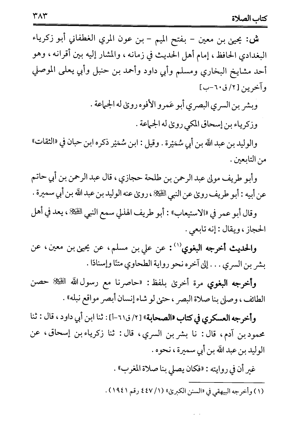 وأخرجه البغوي مرة أخرى بلفظ: "حاضرنا مع رسول الله - عليه السلام - حصن الطائف، وصلى بنا صلاة البصر، حتى لو شاء إنسان أبصر مواقع نبله".
