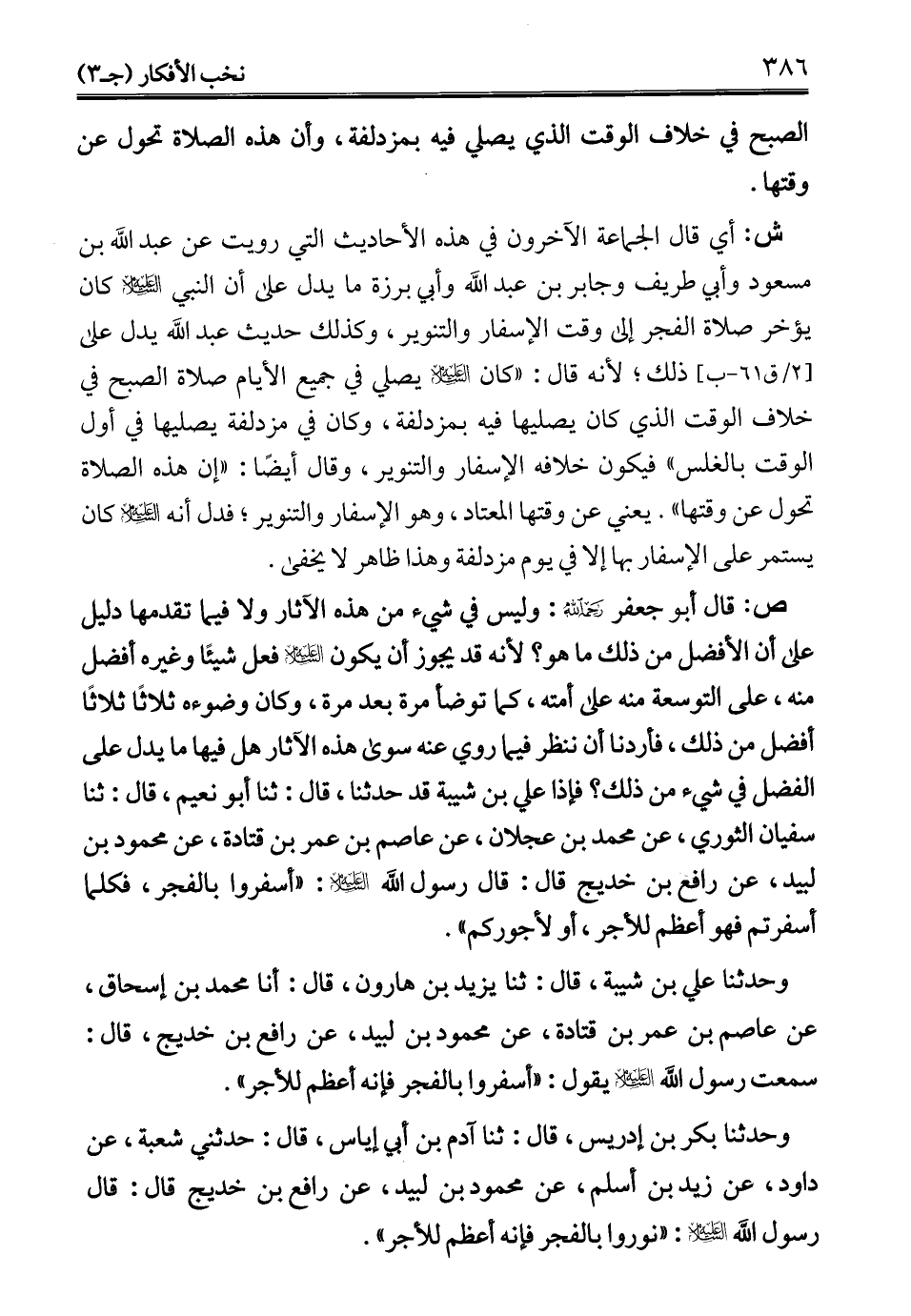 ص: قال أبو جعفر -رحمه الله-: وليس في شيء من هذه الآثار ولا فيما تقدمها دليل على أن الأفضل من ذلك ما هو؟ لأنه قد يجوز أن يكون - عليه السلام - فعل شيئًا وغيره أفضل منه، على التوسعة منه على أمته، كما توضأ مرة بعد مرة، وكان وضوءه ثلاثًا ثلاثًا أفضل من ذلك، فأردنا أن ننظر فيما روي عنه سوى هذه الآثار هل فيها ما يدل على الفضل في شيء من ذلك؟ فإذا علي بن شيبة قد حدثنا، قال: ثنا أبو نعيم، قال: ثنا سفيان الثوري، عن محمد بن عجلان، عن عاصم بن عمر بن قتادة، عن محمود بن لبيد، عن رافع بن خديج قال: قال رسول الله - عليه السلام -: "أسفروا بالفجر، فكلما أسفرتم فهو أعظم للأجر، أو لأجوركم".