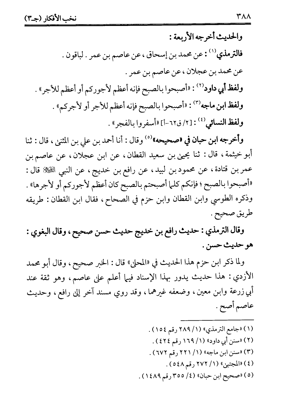وأخرجه ابن حبان في "صحيحه" (¬5) وقال: أنا أحمد بن علي بن المثنى، قال: ثنا أبو خيثمة، قال: ثنا يحيى بن سعيد القطان، عن ابن عجلان، عن عاصم بن عمر بن قتادة، عن محمود بن لبيد، عن رافع بن خديج، عن النبي - عليه السلام - قال: "أصبحوا بالصبح؛ فإنكم كلما أصبحتم بالصبح كان أعظم لأجوركم أو لأجرها". وذكره الطوسي وابن القطان وابن حزم في الصحاح، فقال ابن القطان: طريقه طريق صحيح.