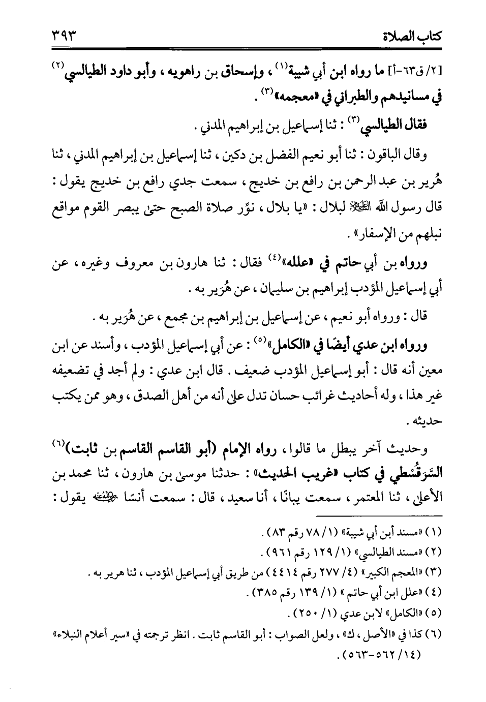 وقال الباقون: ثنا أبو نعيم الفضل بن دكين، ثنا إسماعيل بن إبراهيم المدني، ثنا هُرير بن عبد الرحمن بن رافع بن خديج، سمعت جدي رافع بن خديج يقول: قال رسول الله - عليه السلام - لبلال: "يا بلال، نوِّر صلاة الصبح حتى يبصر القوم مواقع نبلهم من الإسفار".