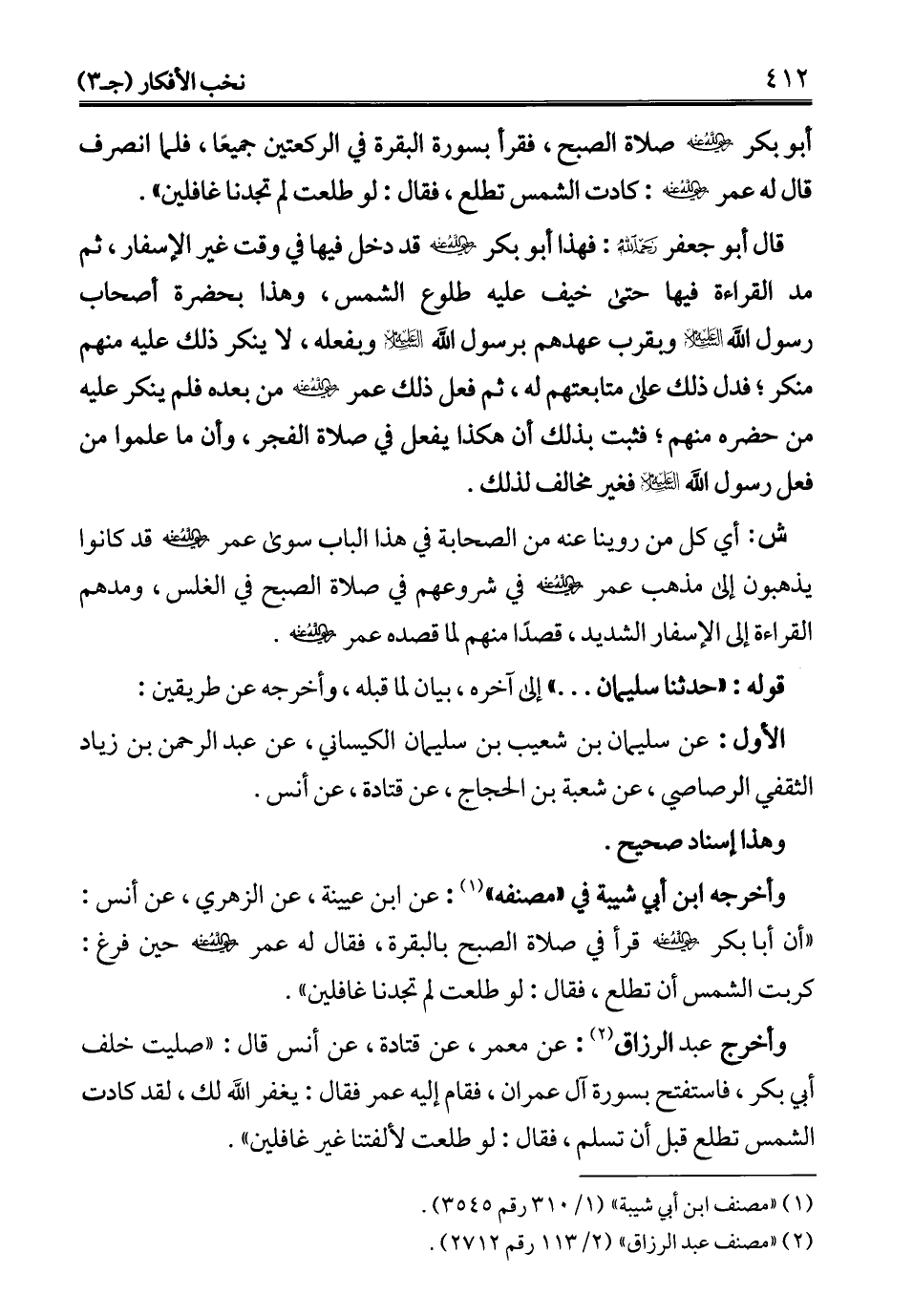 وأخرج عبد الرزاق (¬2): عن معمر، عن قتادة، عن أنس قال: "صليت خلف أبي بكر، فاستفتح بسورة آل عمران، فقام إليه عمر فقال: يغفر الله لك، لقد كادت الشمس تطلع قبل أن تسلم، فقال: لو طلعت لألفتنا غير غافلين".