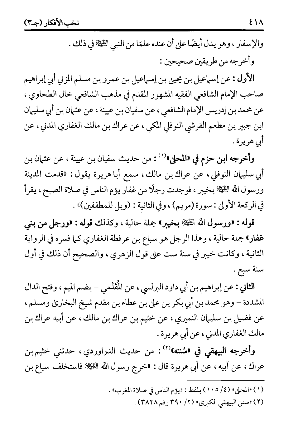 وأخرجه ابن حزم في "المحلى" (¬1): من حديث سفيان بن عيينة، عن عثمان بن أبي سليمان النوفلي، عن عراك بن مالك، سمع أبا هريرة يقول: "قدمت المدينة ورسول الله - عليه السلام - بخيبر، فوجدت رجلًا من غفار يؤم الناس في صلاة الصبح، يقرأ في الركعة الأول. سورة (مريم)، وفي الثانية: (ويل للمطففين) ".