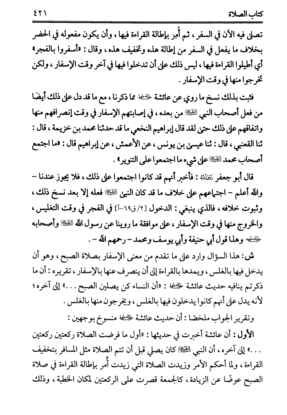 قال أبو جعفر -رحمه الله-: فأخبر أنهم قد كانوا اجتمعوا على ذلك، فلا يجوز عندنا -والله أعلم- اجتماعهم على خلاف ما قد كان النبي - عليه السلام - فعله إلا بعد نسخ ذلك، وثبوت خلافه، فالذي ينبغي: الدخول في الفجر في وقت التغليس، والخروج منها في وقت الإسفار، على موافقة ما روينا عن رسول الله - عليه السلام - وأصحابه - رضي الله عنهم - هذا قول أبي حنيفة وأبي يوسف ومحمد -رحمهم الله-.