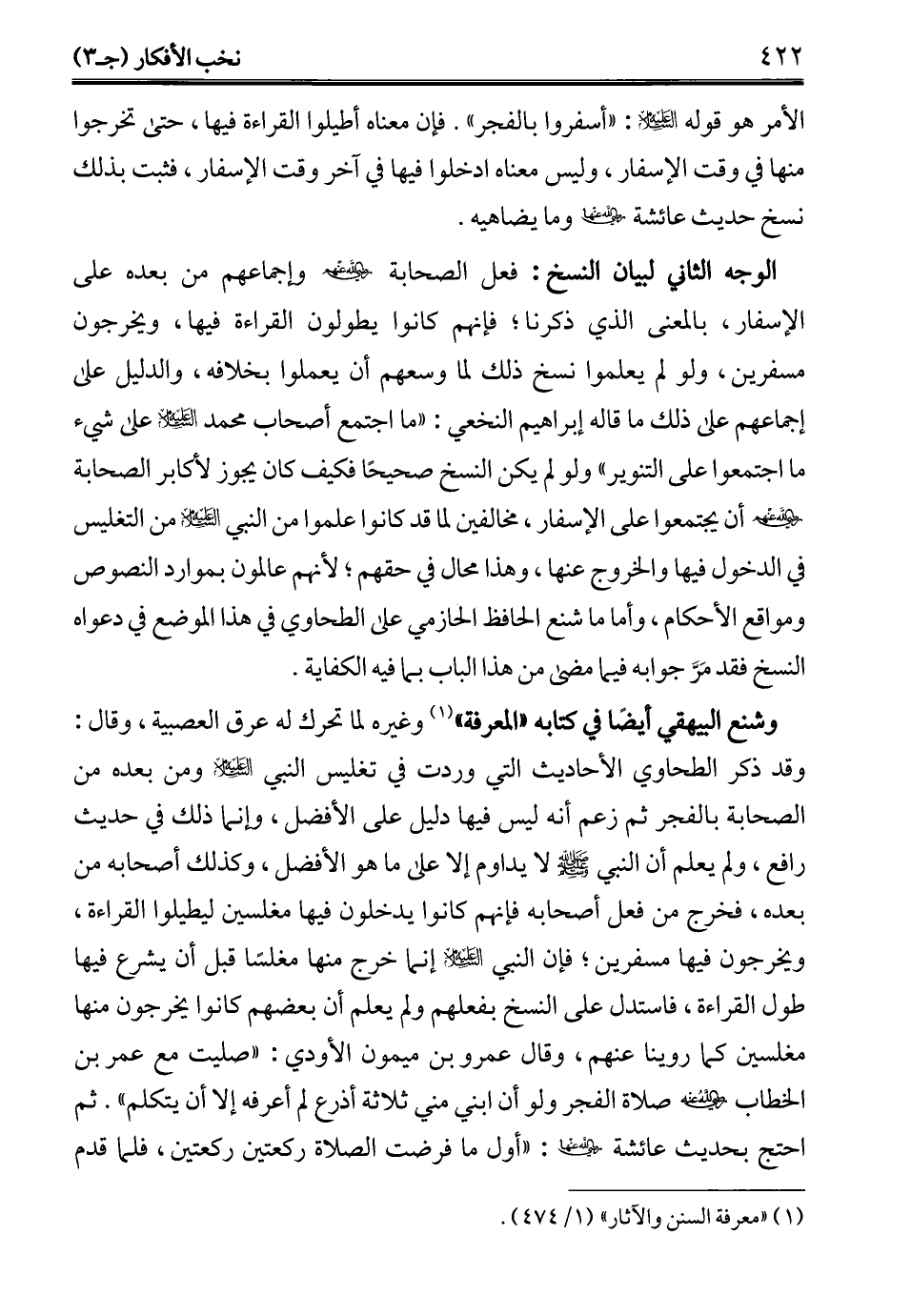 الوجه الثاني لبيان النسخ: فعل الصحابة - رضي الله عنهم - وإجماعهم من بعده على الإسفار، بالمعنى الذي ذكرنا؛ فإنهم كانوا يطولون القراءة فيها، ويخرجون مسفرين، ولو لم يعلموا نسخ ذلك لما وسعهم أن يعملوا بخلافه، والدليل على إجماعهم على ذلك ما قاله إبراهيم النخعي: "ما اجتمع أصحاب محمَّد - عليه السلام - على شيء ما اجتمعوا على التنوير" ولو لم يكن النسخ صحيحًا فكيف كان يجوز لأكابر الصحابة - رضي الله عنهم - أن يجتمعوا على الإسفار، مخالفين لما قد كانوا علموا من النبي - عليه السلام - من التغليس في الدخول فيها والخروج عنها، وهذا محال في حقهم؛ لأنهم عالمون بموارد النصوص ومواقع الأحكام، وأما ما شنع الحافظ الحازمي على الطحاوي في هذا الموضع في دعواه النسخ فقد مَرَّ جوابه فيما مضى من هذا الباب بما فيه الكفاية.