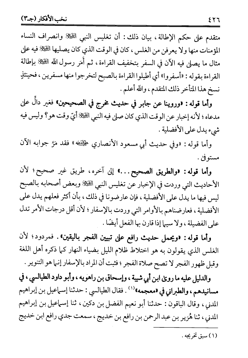 وأما قوله: "ويحمل حديث رافع على تبيين الفجر باليقين". فمردود؛ لأن الغلس الذي يقولون به هو اختلاط ظلام الليل بضياء النهار كما ذكره أهل اللغة وقبل ظهور الفجر لا تصح صلاة الفجر؛ فثبت أن المراد بالإسفار إنما هو التنوير.