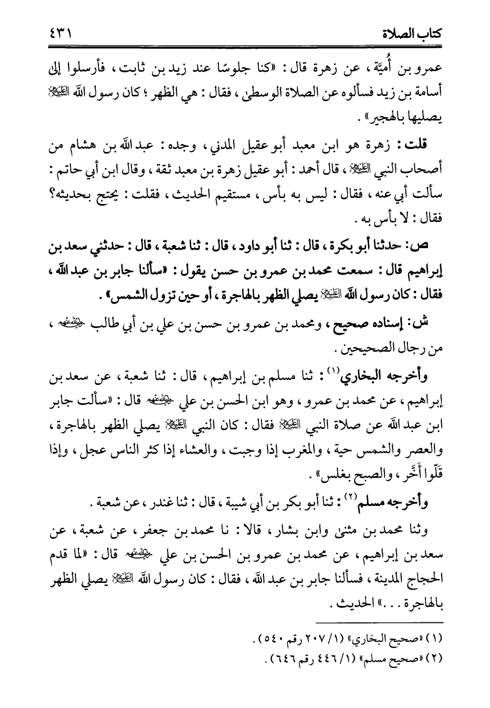 وثنا محمد بن مثنى وابن بشار، قالا: نا محمد بن جعفر، عن شعبة، عن سعد بن إبراهيم، عن محمَّد بن عمرو بن الحسن بن علي - رضي الله عنهم - قال: "لما قدم الحجاج المدينة، فسألنا جابر بن عبد الله، فقال: كان رسول الله - عليه السلام - يصلي الظهر بالهاجرة ... " الحديث.