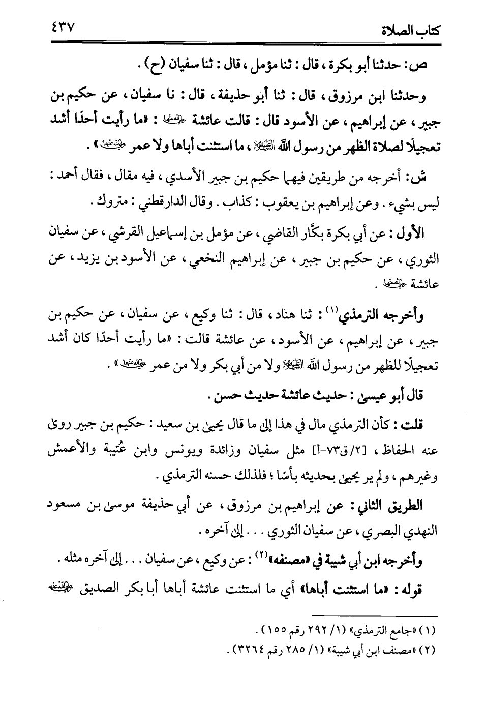 وحدثنا ابن مرزوق، قال: ثنا أبو حذيفة، قال: نا سفيان، عن حكيم بن جبير، عن إبراهيم، عن الأسود قال: قالت عائشة - رضي الله عنها -: "ما رأيت أحدًا أشد تعجيلًا لصلاة الظهر من رسول الله - عليه السلام -، ما استثنت أباها ولا عمر - رضي الله عنهما -".