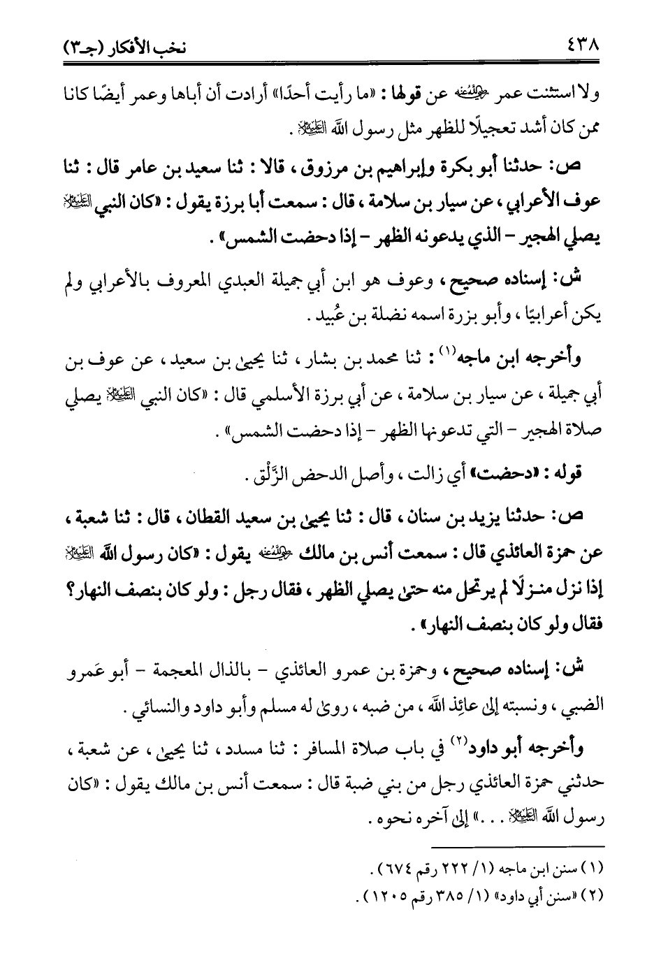 ص: حدثنا أبو بكرة وإبراهيم بن مرزوق، قالا: ثنا سعيد بن عامر قال: ثنا عوف الأعرابي، عن سيار بن سلامة، قال: سمعت أبا برزة يقول: "كان النبي - عليه السلام - يصلي الهجير -الذي يدعونه الظهر- إذا دحضت الشمس".